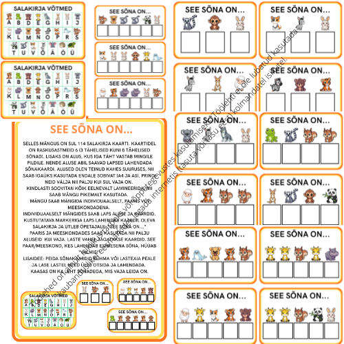 SELLES MÄNGUS ON SUL 114 SALAKIRJA KAARTI. KAARTIDEL ON RASKUSASTMEID 6 (3 TÄHELISED KUNI 8 TÄHELISED SÕNAD). LISAKS ON ALUS, KUS IGA TÄHT VASTAB MINGILE PILDILE. NENDE ALUSE ABIL SAAVAD LAPSED LAHENDADA SÕNAKAARDI. ALUSED OLEN TEINUD KAHES SUURUSES, NII SAAB IGAÜKS KASUTADA ENDALE SOBIVAT (A4 JA A5). PRINDI NEID VÄLJA NII PALJU KUI SUL VAJA ON.