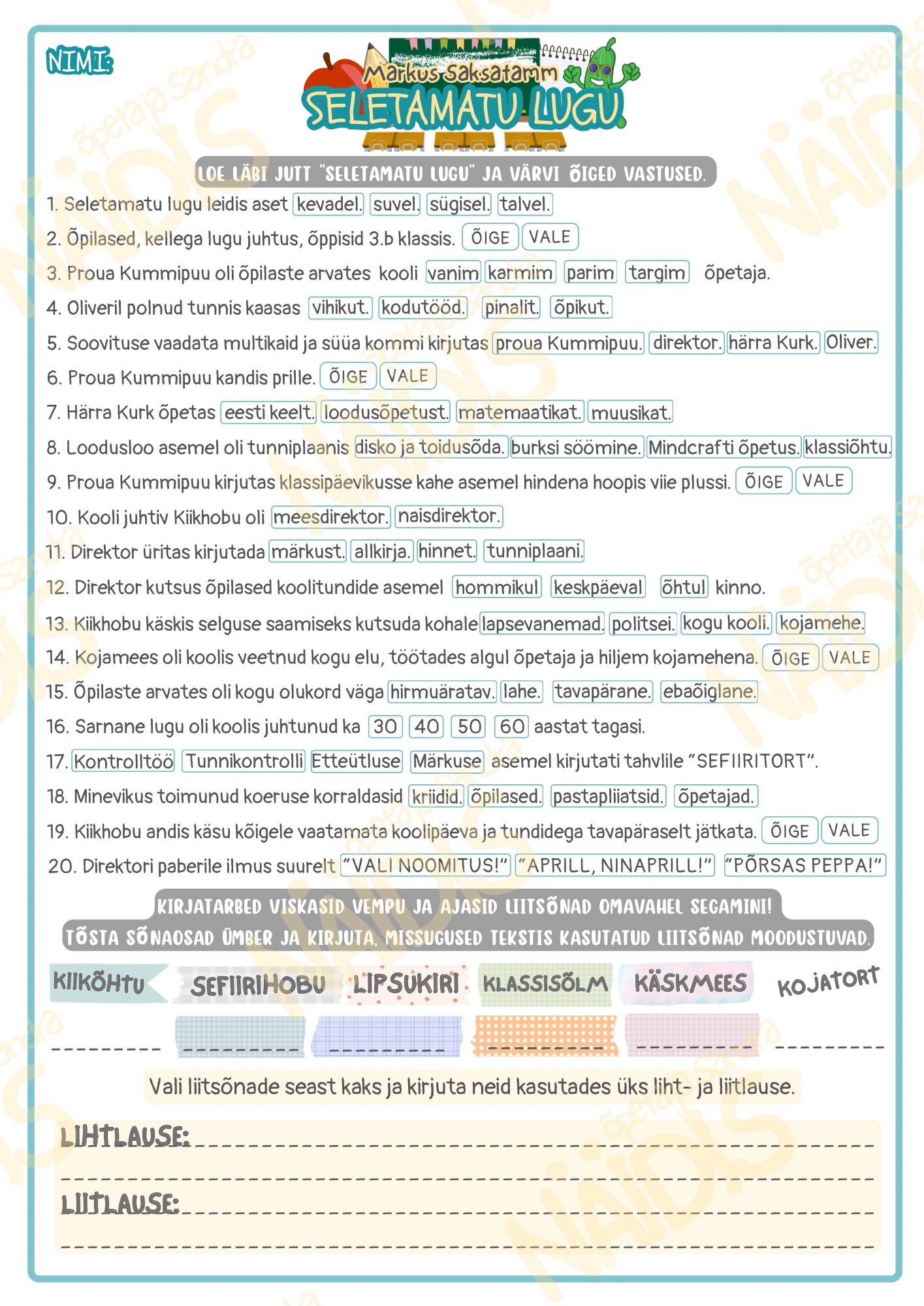 🥸 “SELETAMATU LUGU” (MARKUS SAKSATAMM) TEKSTIL PÕHINEV FUNKTSIONAALSET LUGEMISOSKUST ARENDAV LUGEMISTEST-TÖÖLEHT 🤓