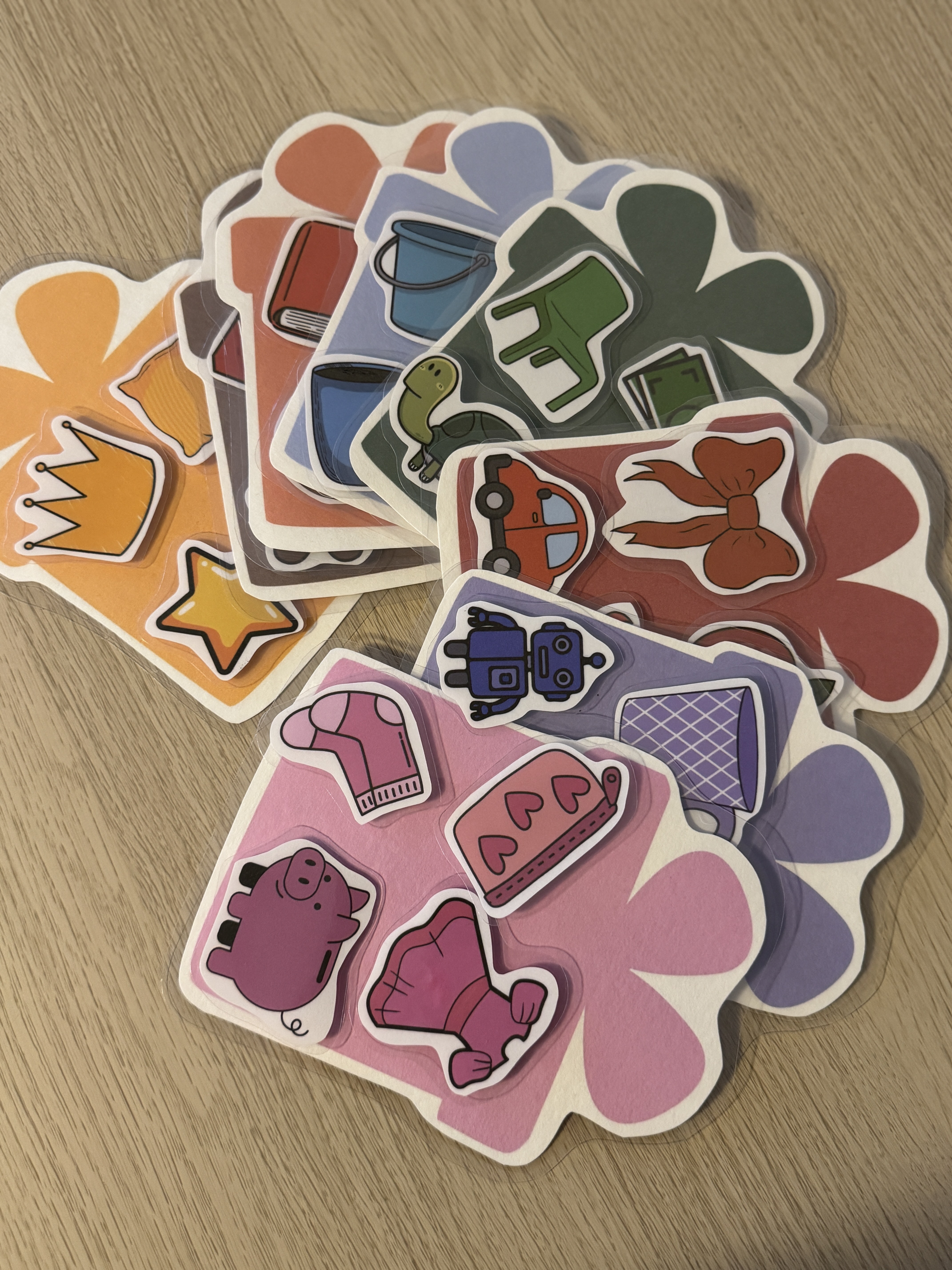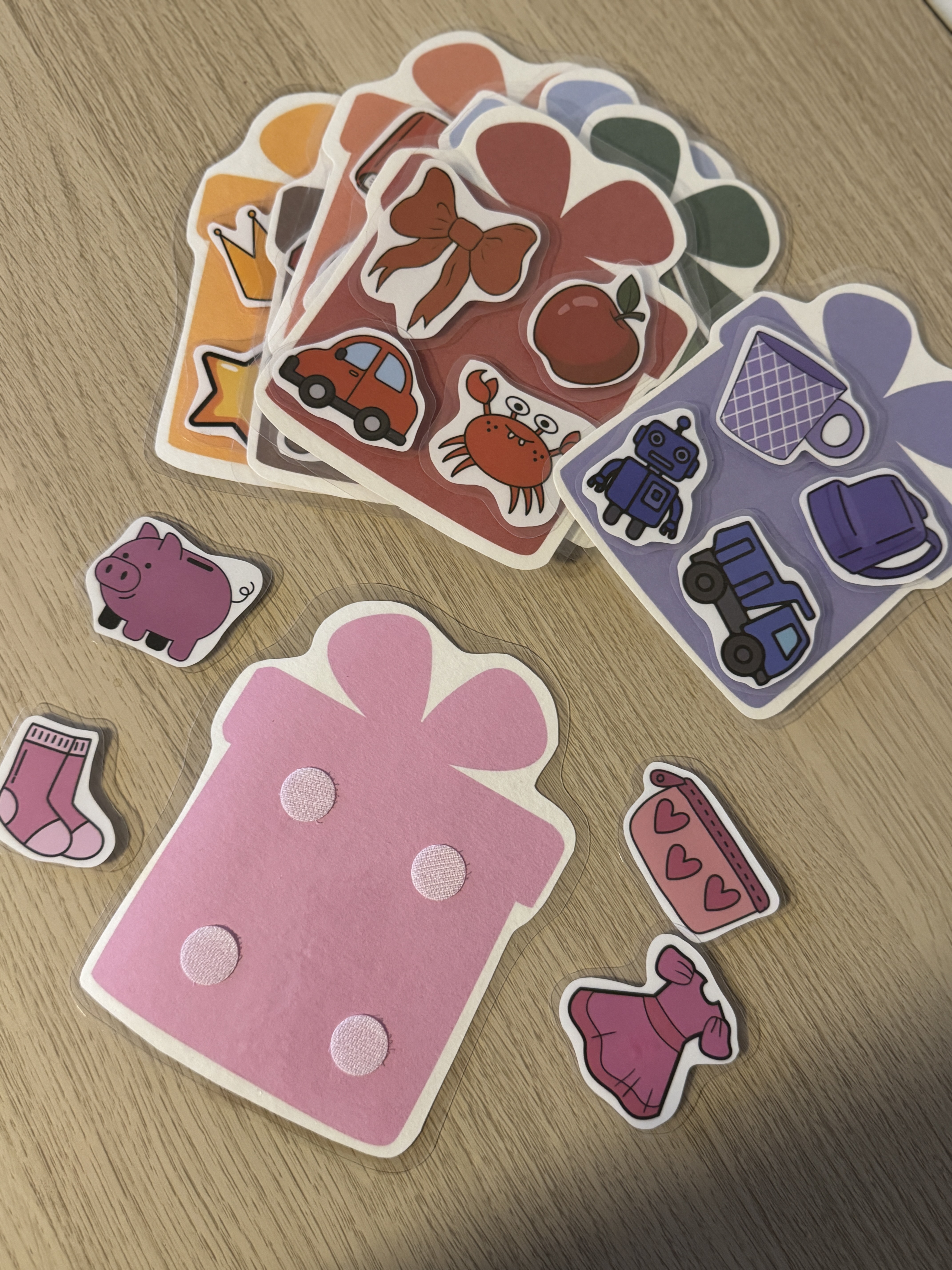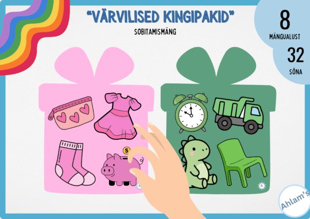 Mänguline ja visuaalne õppevahend, mis toetab lapse kõne arengut, sõnavara laienemist ja lauseloome oskust. Pildikaartide abil saab nimetada esemeid, kirjeldada neid, luua seoseid ja moodustada lauseid. Mängus on 8 värvilist kingipakki ehk mängualust ja igale alusele tuleb sobitada 4 pilti. Kõik pildid on valitud mängu just sõnavara täiendamise eesmärgil, seega mäng sobib just eriti nendele lastele, kes vajavad sõnavara täiendamist.