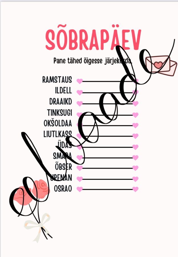 Sõbrapäeva-teemaliste sõnade tähed tuleb uuesti õigesse järjekorda panna. Vastused on faili teisel leheküljel.