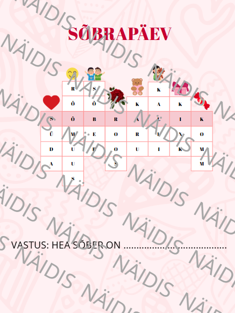 Sõbrapäeva ristsõna piltidega. Failis on nii roosal kui ka valgel põhjal ristsõna ning vastused.