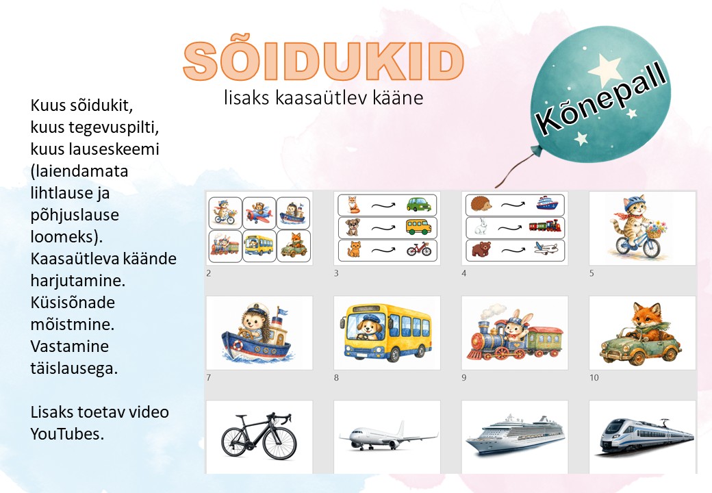 Kuus sõidukit, kuus tegevuspilti, kuus lauseskeemi (laiendamata lihtlause ja põhjuslause loomeks).