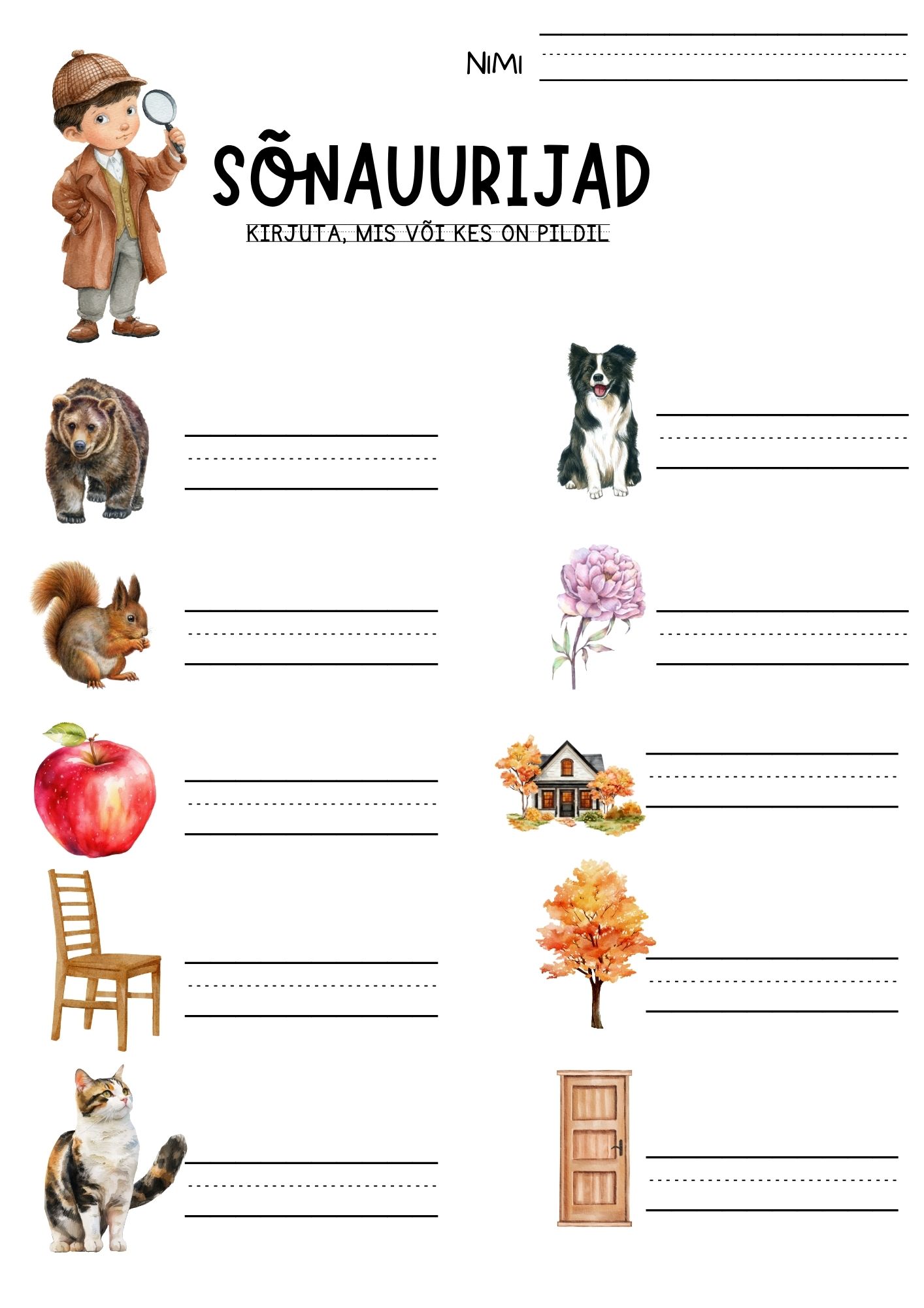 Kirjuta joonte vahele sõna, mida/keda näed pildil. 2lk