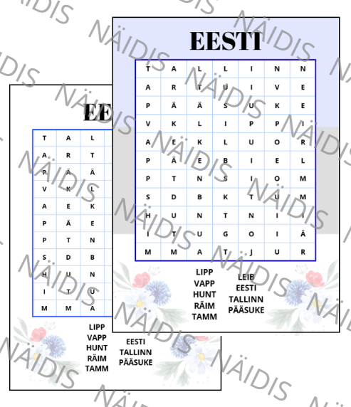 Eestiteemaline sõnarägastik. Failis on nii sini-must-valgel kui ka valgel põhjal tööleht ning vastused.