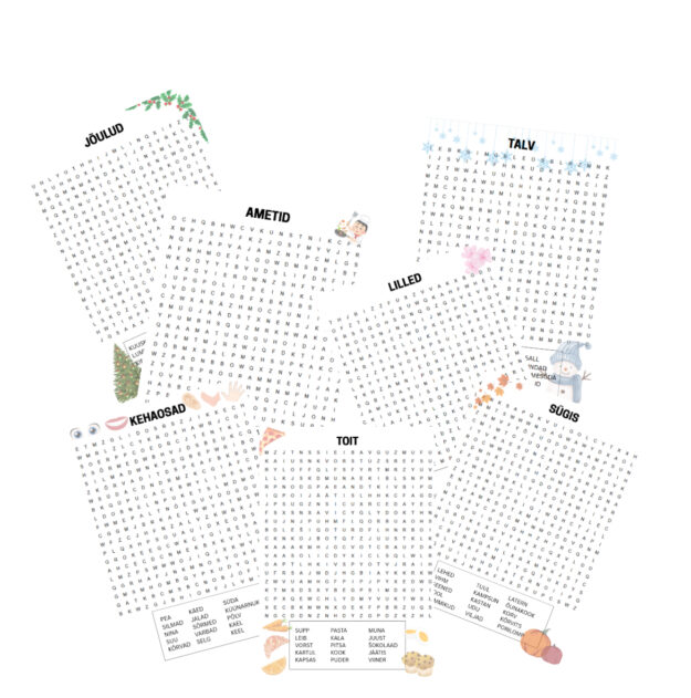 Jõulud, ametid, suvi, sügis, lilled, loomad, puud, kehaosad, riigid, toit, talv, kevad.