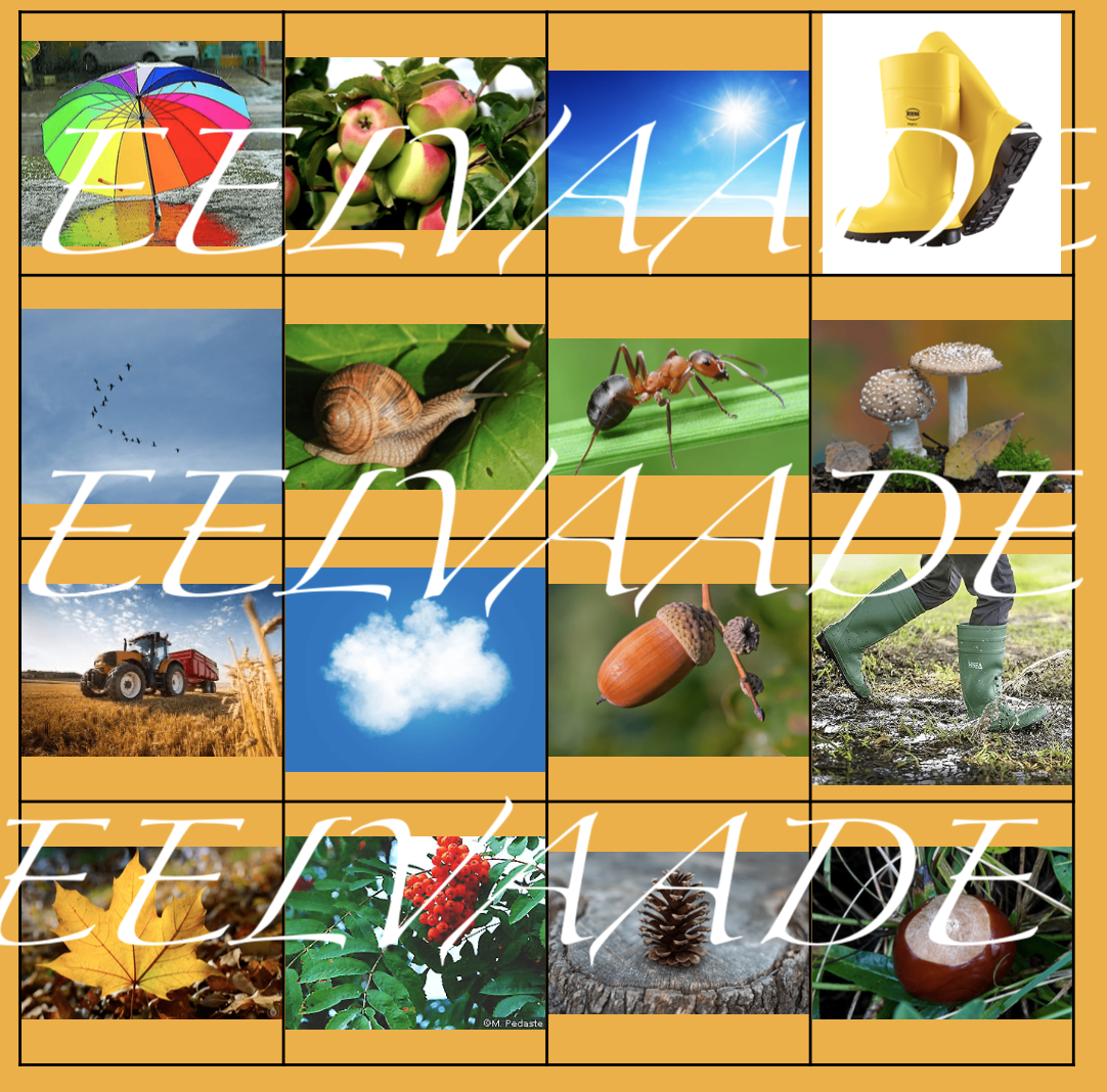 Tööleht sisaldab värvilist piltidega ruudustikku, kus on kujutatud sügise tunnuseid. Tegevus võimaldab klassiga õues liikuda ning otsida erinevaid piltidel olevaid asju (nt tammetõru, langenud kollane puuleht jne).