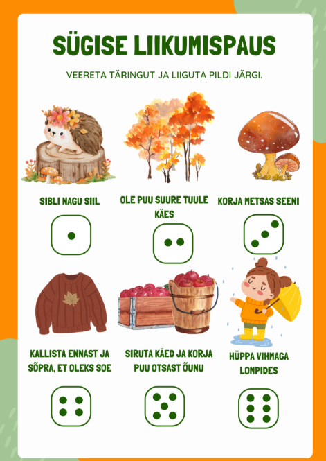 Sügise teemaline liikumispaus tundi. Veereta täringut, loe ning liiguta vastavalt juhisele.