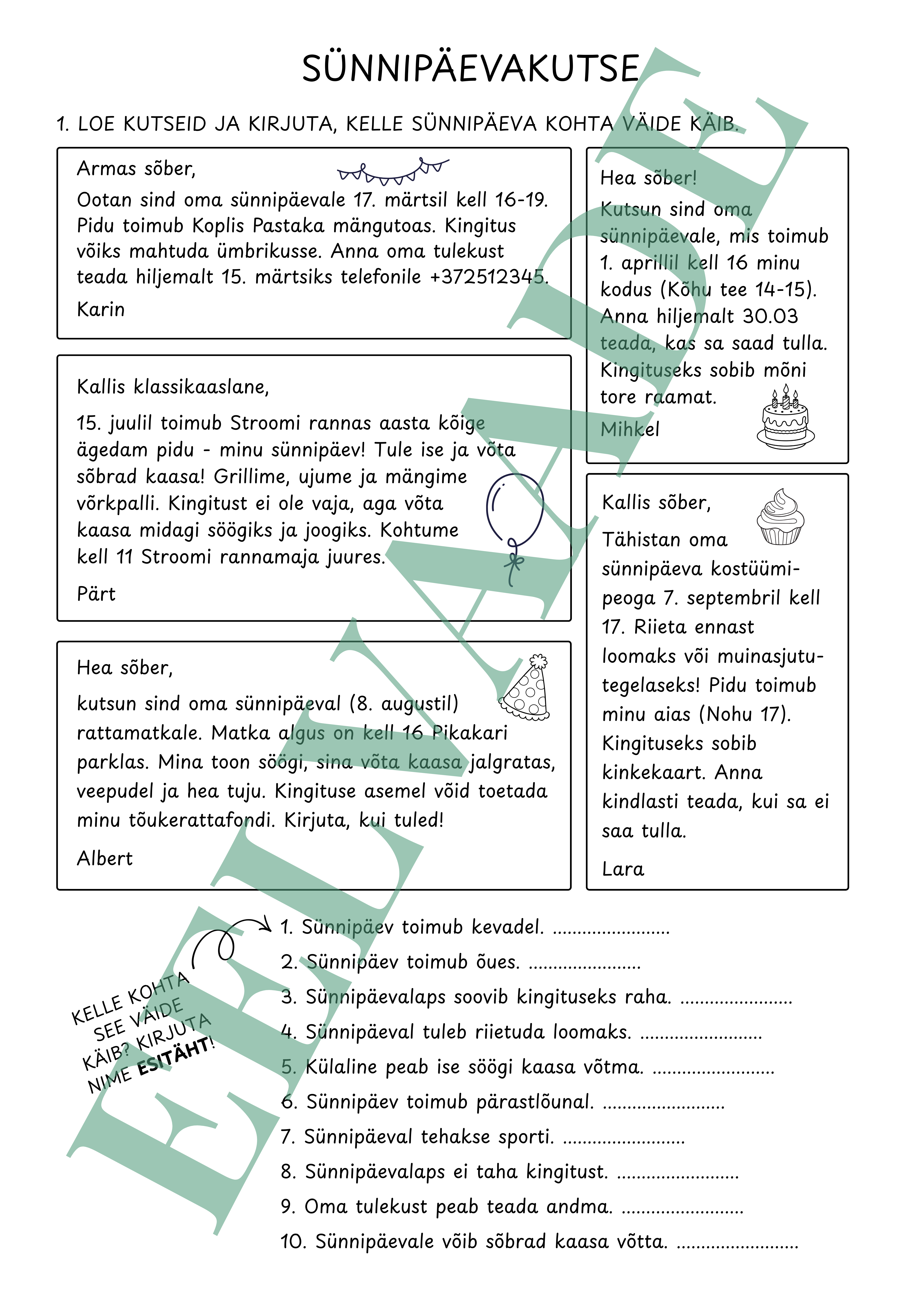 Õpilased loevad sünnipäevakutseid ning lahendavad tekstide põhjal erinevaid ülesandeid. Lõpuks kirjutavad õpilased ise piltide põhjal kutse.