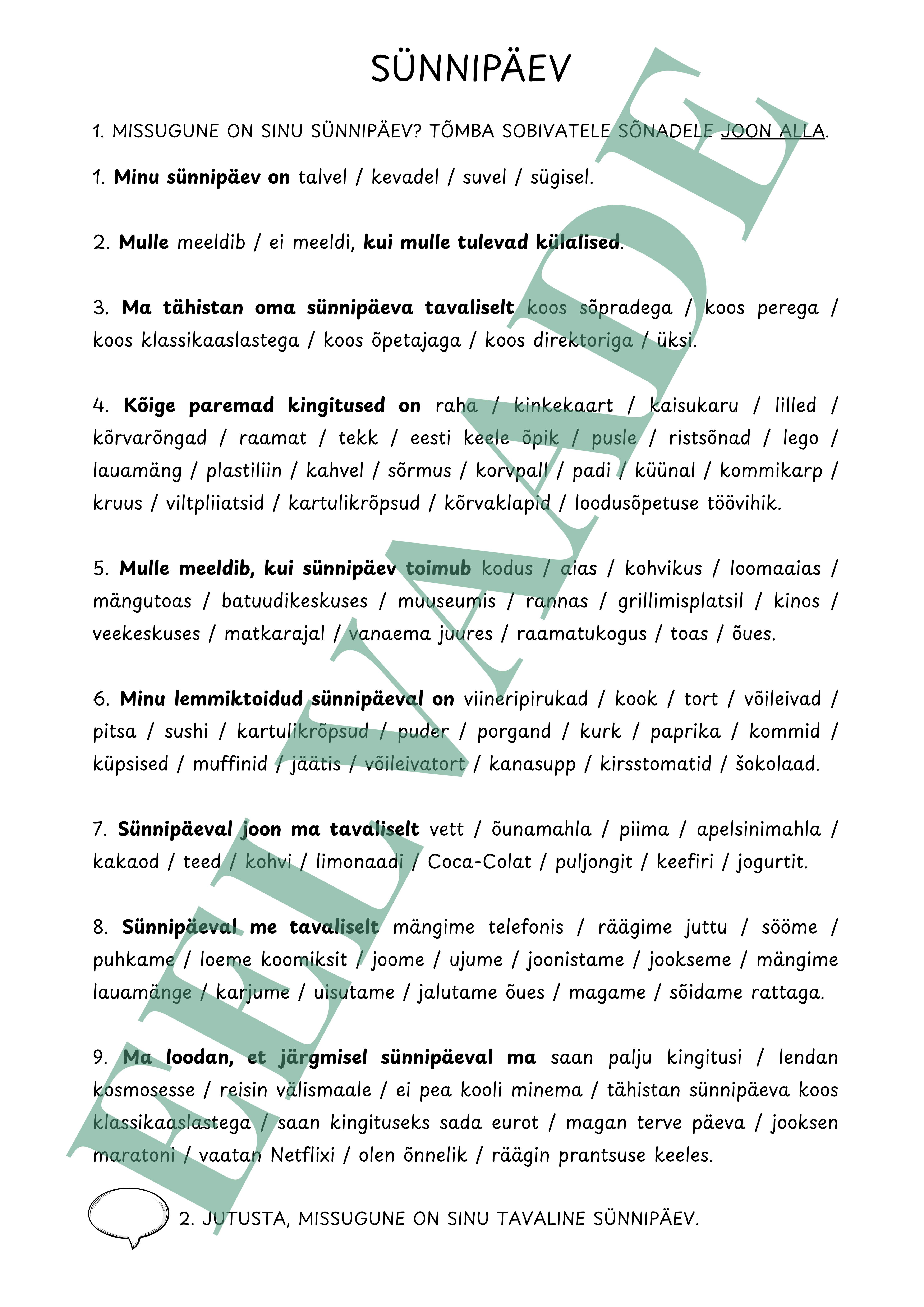 Tööleht, mis aitab õpilasel kirjutada ja jutustada oma sünnipäevast. Antud on lause algused – õpilased tõmbavad sobivatele vastustele joone alla. Hiljem saab nende lausemallide järgi õppida oma sünnipäevast jutustama.