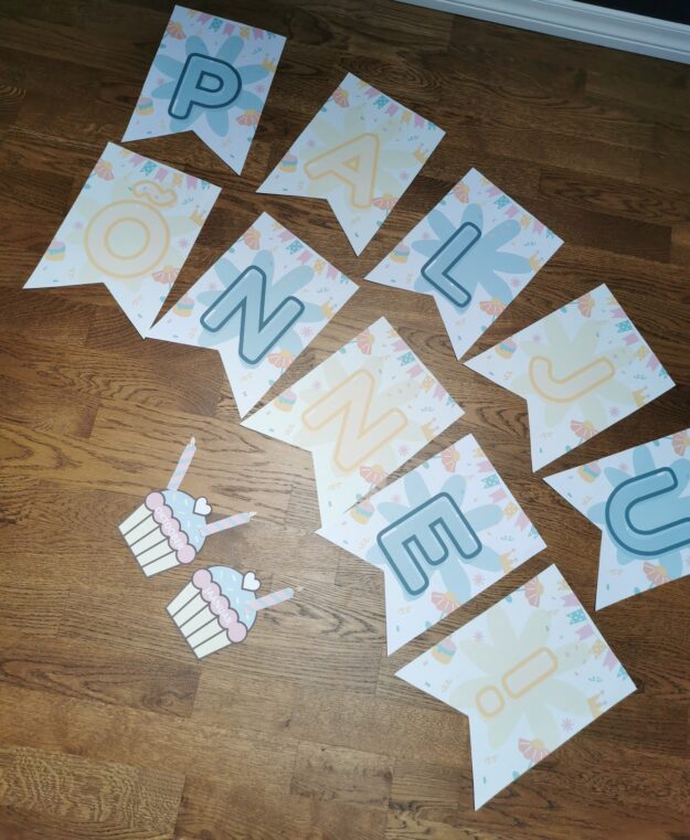 Kaunista rühmaruum sünnipäevabänneriga. Sisaldab bännerit “PALJU ÕNNE!”, 12 muffinit koos kuude nimetustega ning 29 küünalt, millele kirjutada peale laste nimed.