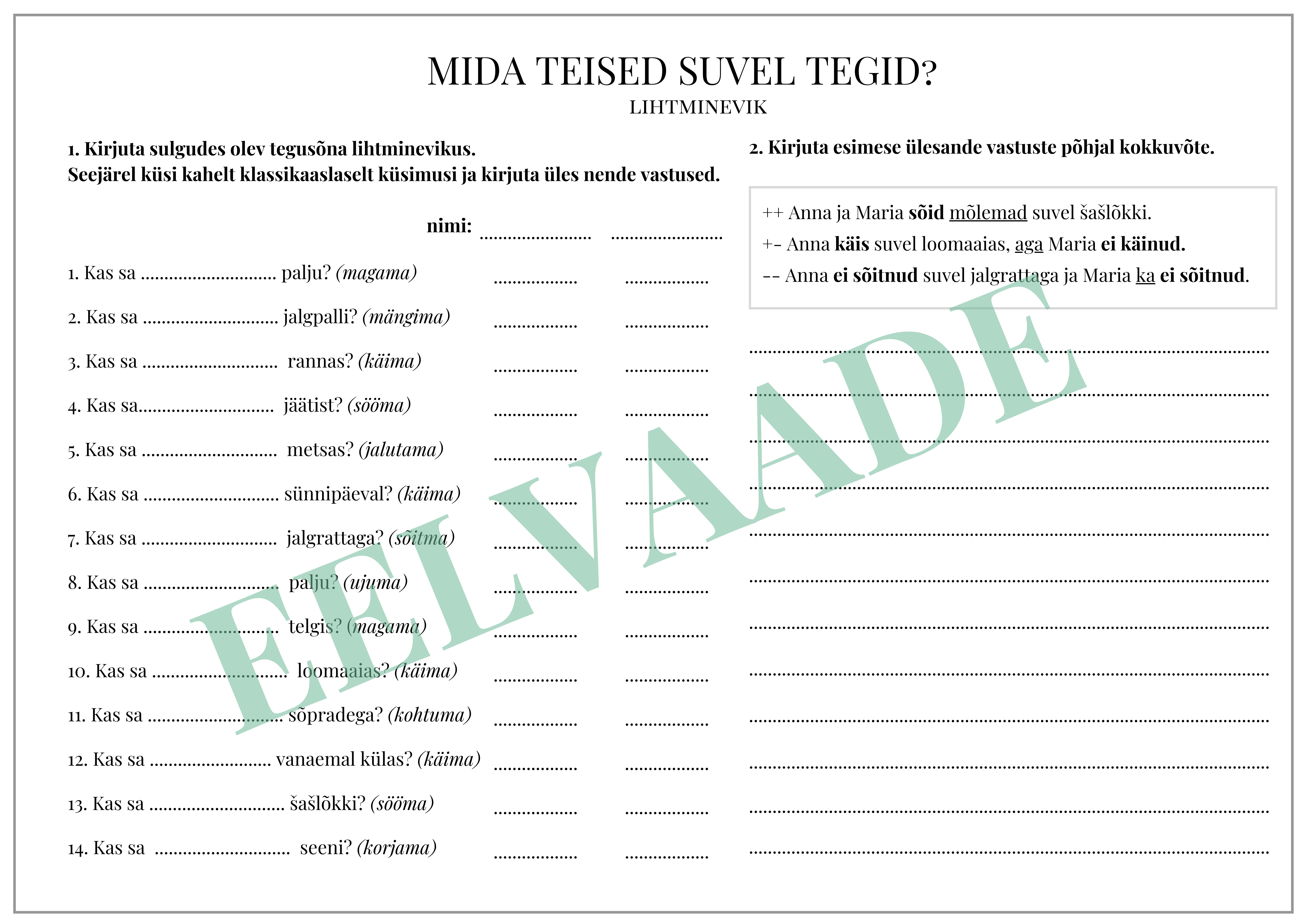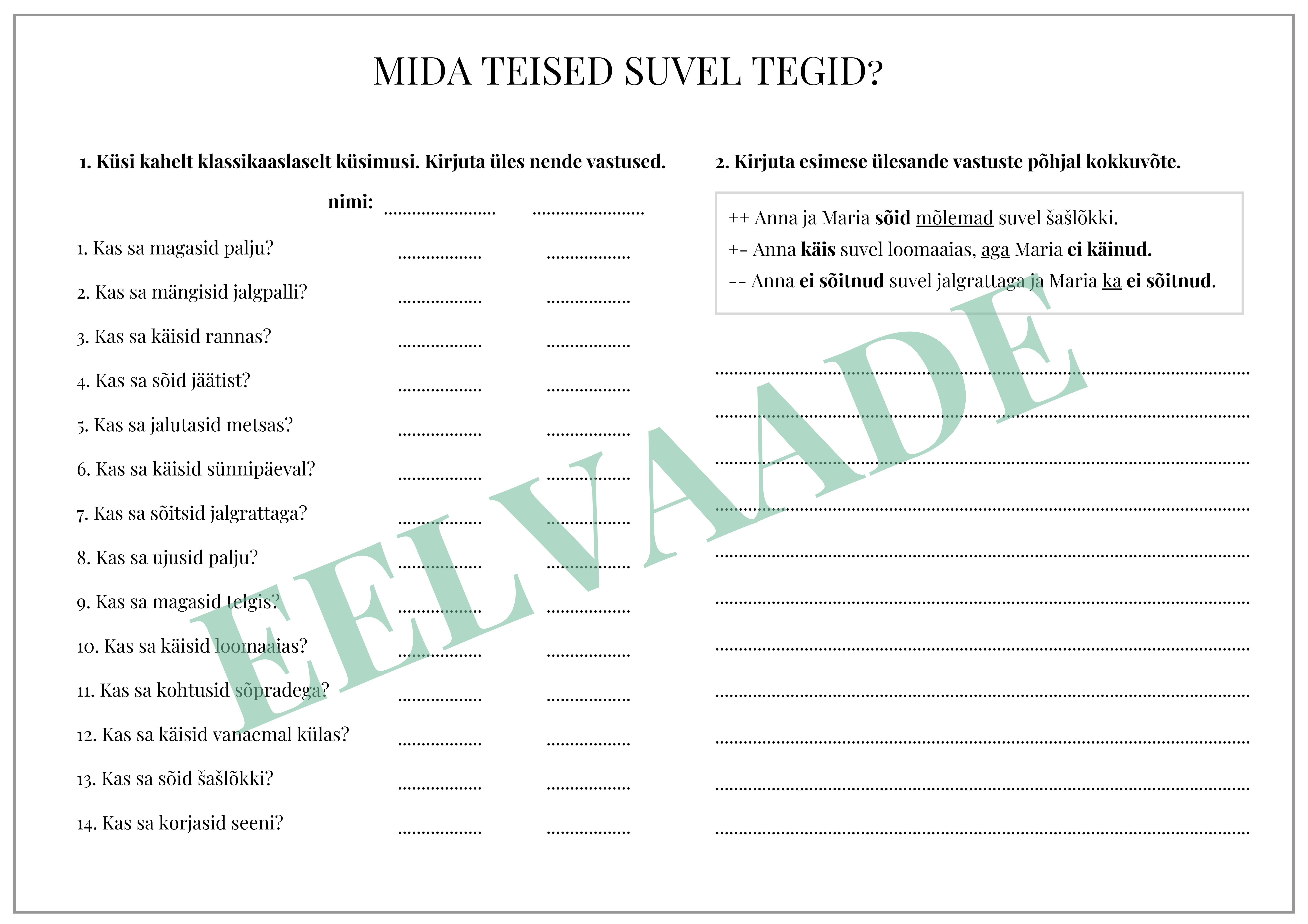 Töölehe abil saavad õpilased üksteiselt suve kohta küsimusi küsida ning selle põhjal väikese teksti kirjutada. Lisaks on võimalik harjutada lihtmineviku vormide moodustamist. Töölehest on kaks versiooni – ühel peab kõigepealt ise tegusõna lihtminevikus kirjutama, teisel on tegusõna juba lihtminevikus.