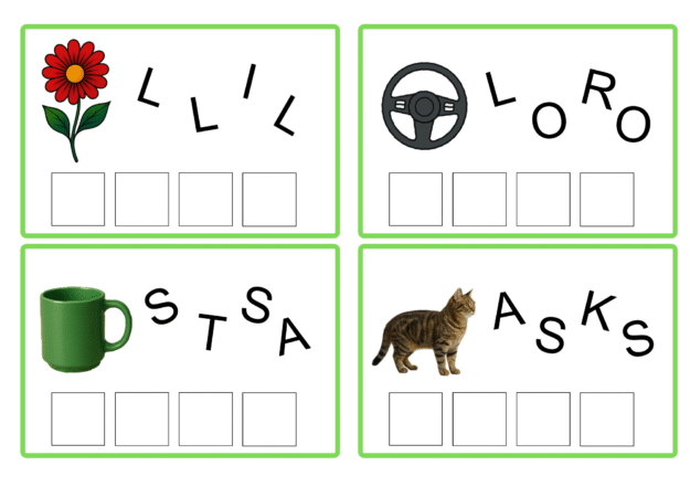 Kirjutamis- ja lugemisoskuse arendamiseks kaardid “Tähed õigesse järjekorda”. Kokku 36 sõna.