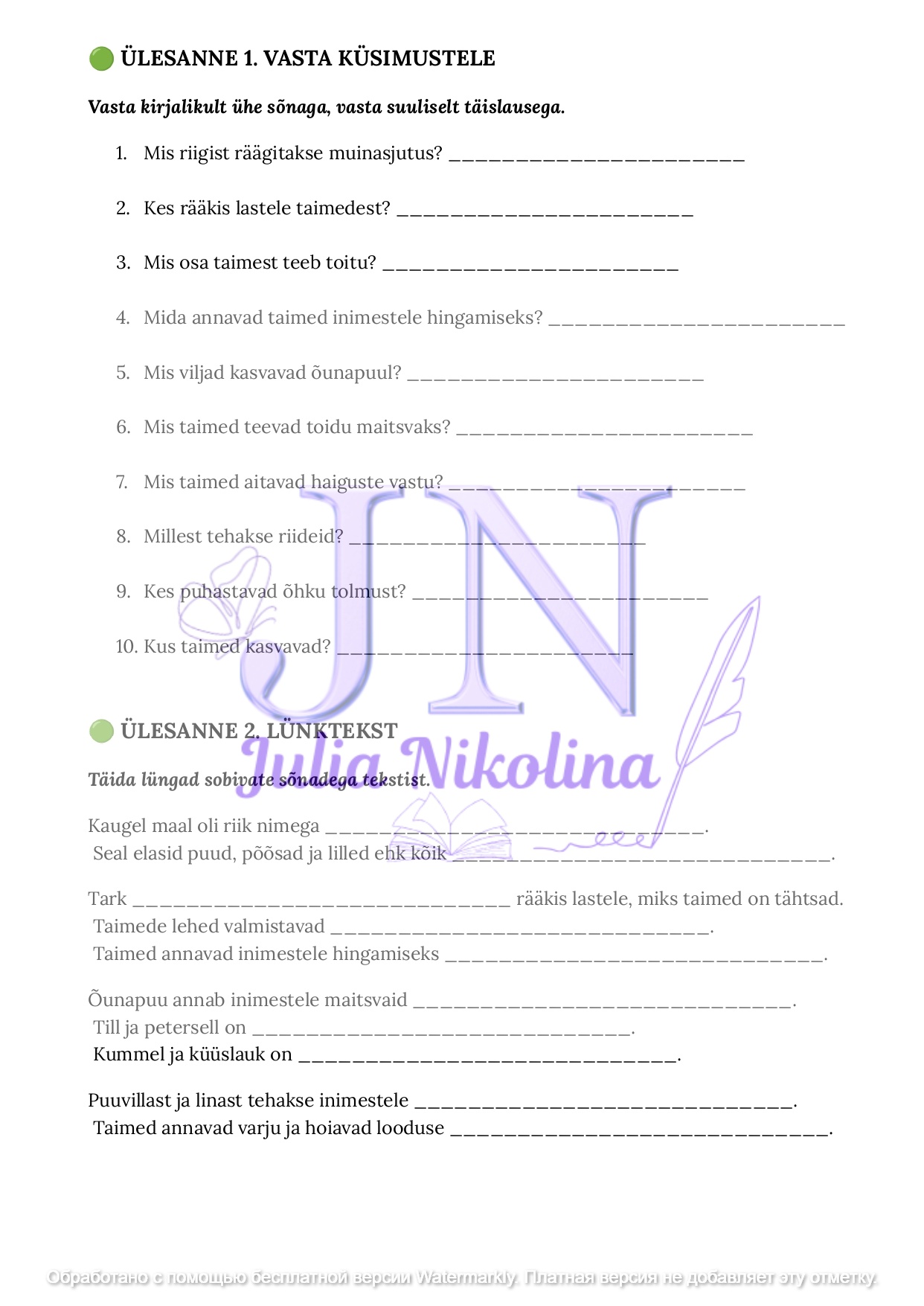 See õppematerjal on mõeldud 3.–4. klassi õpilastele ning tutvustab taimede rolli inimese elus muinasjutu ja mitmekesiste tööülesannete kaudu. Materjal sobib kasutamiseks loodusõpetuse ning lugemisoskuse arendamise tundides.