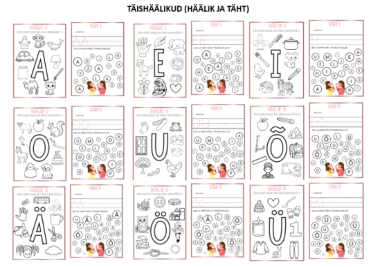 Iga täishääliku õppimiseks on kaks töölehte: hääliku kuulmine sõnas + pildi värvimine ja tähe kirjutamise harjutamine, tähekuju leidmine teiste seast.