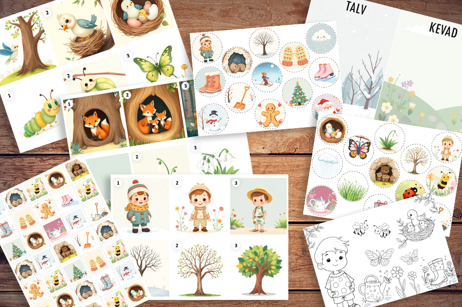 Failis on kokku 8 lehekülge. 3 lehekülge, kus igal 2 pildirida, millest saab kokku jutukese, mis iseloomustab kevade tulekut. 3 lehekülge on selleks, et talve ja kevade sümboleid välja lõigates saab laps asetada pildi sobivalt, kas talve või kevade peale. Ühtlasi saab nende piltidega mängida ka memoriini, kui printida topelt. 1 lehekülg on loendamiseks ning üks lehekülg on kevadine pilt värvimiseks.