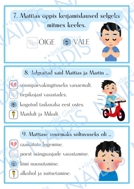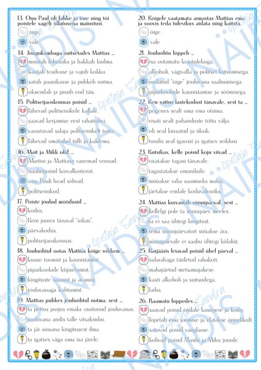 🕵🏻♀️ Kuna minu enda klass väga armastab taolisi raamatuteste täita ringi liikudes ja otsides, siis olen testist koostanud ka n-ö liikuva lugemiskontrollina täidetava variandi (küsimustekaardid ja vastusteleht). Õpetaja kinnitab küsimustekaardid seintele ning õpilased liiguvad, otsivad ja värvivad vastustelehel õiged variandid.