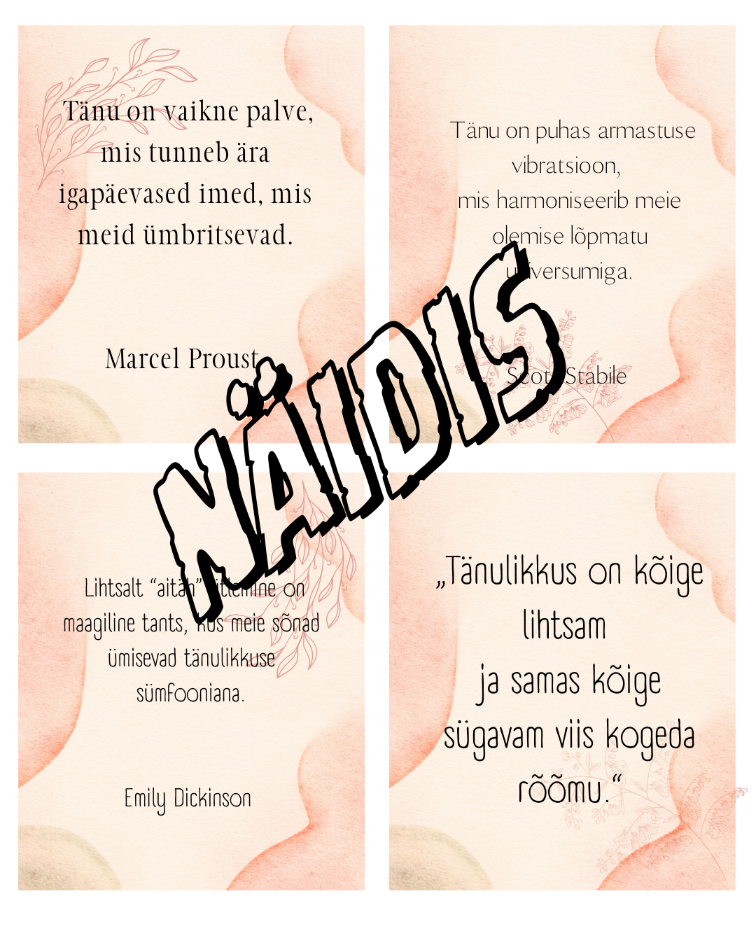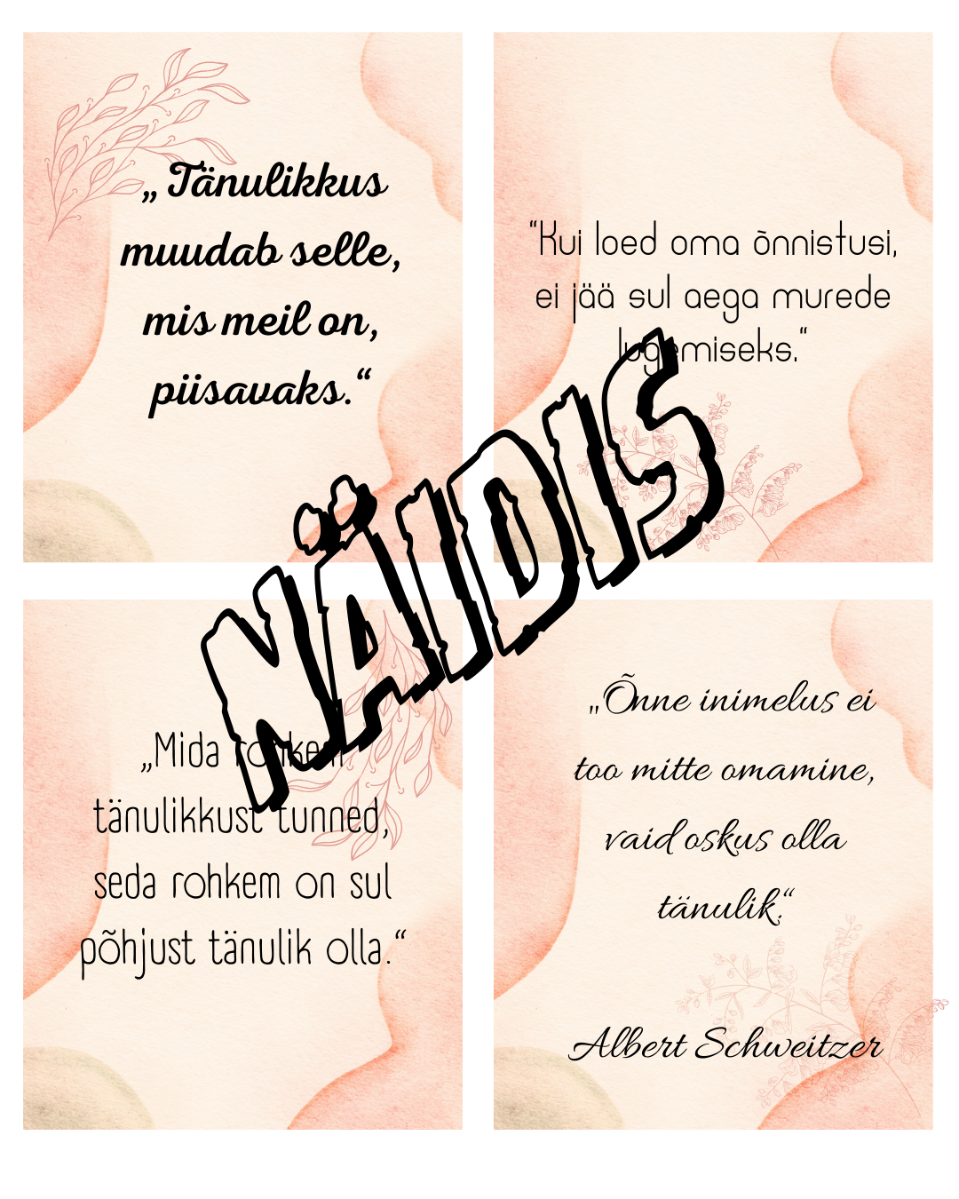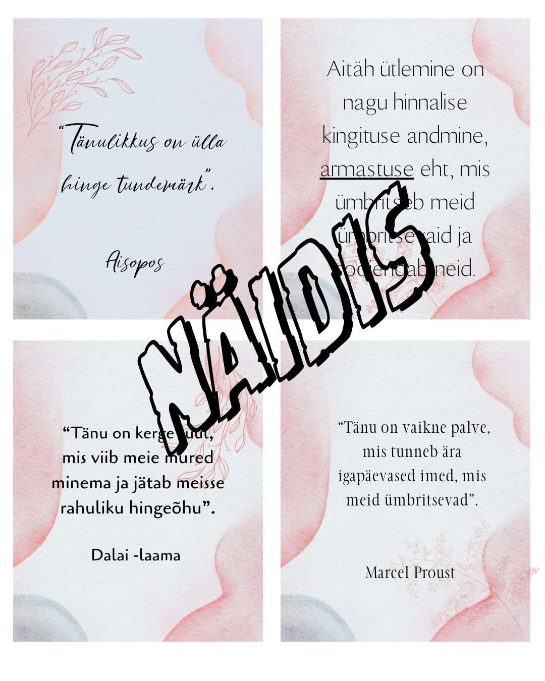 Prinditav komplekt 16 tuntud autorite mõtlemapaneva tänulikkuse tsitaadiga. Sobib kasutamiseks põhikooli tundides, klassijuhatajatunnis ja väärtuskasvatuses – arutelukaartidena või klassiruumi motivatsioonimaterjalina.