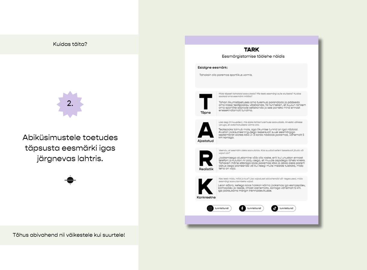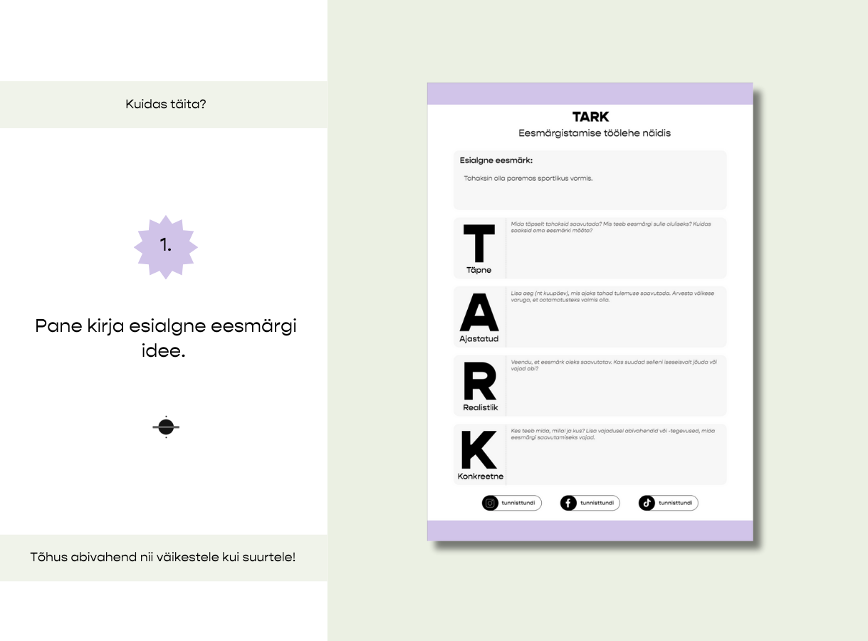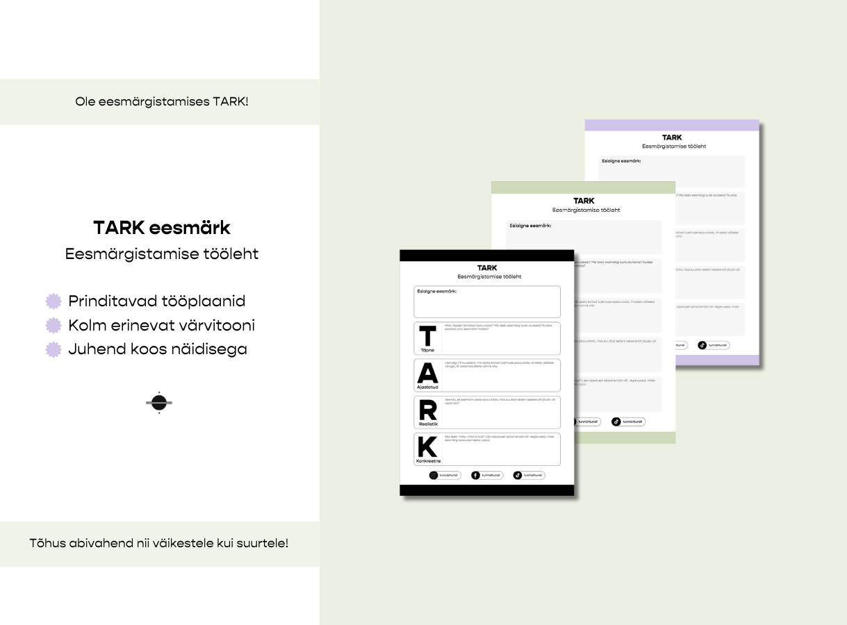TARK eesmärgistamise tööleht on loodud selleks, et aidata sul oma suur unistus muuta täpseks, ajastatuks, realistlikuks ja konkreetseks.