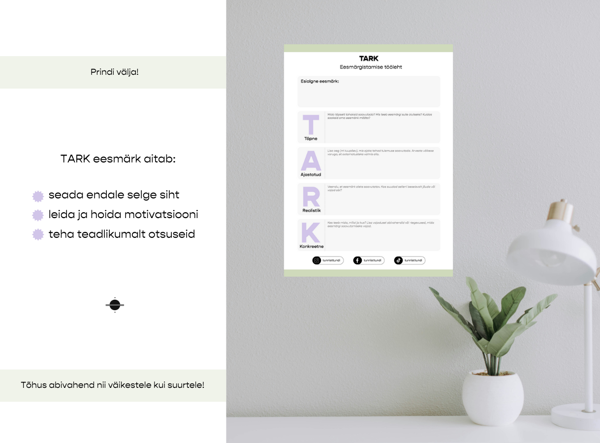 Unistused on suured, aga tegudeni ei jõua? TARK eesmärgistamise tööleht aitab sul oma unistuse muuta täpseks eesmärgiks, mille kaudu oma soovid päriselt ellu viia!