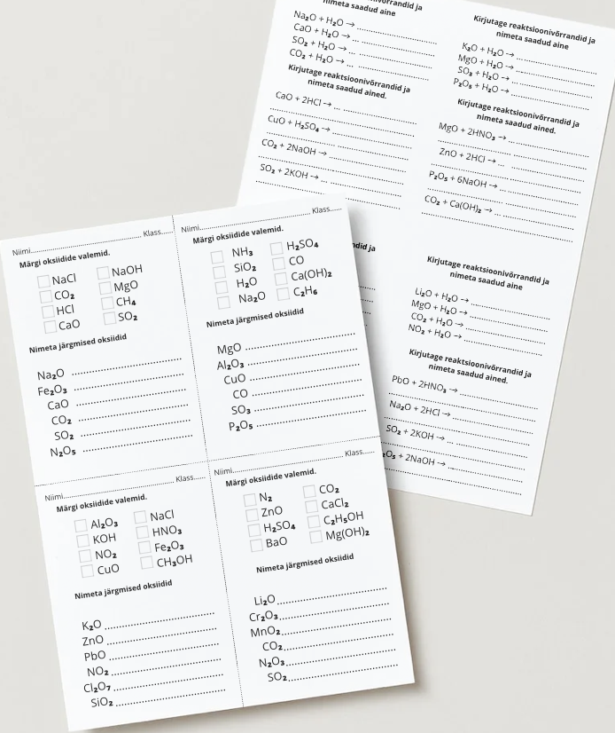Ülesanne 1: Oksiidide nimetamine (4 varianti, igas 6 oksiidi: 3 metallilisi + 3 mittemetallilisi)