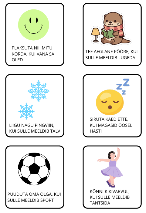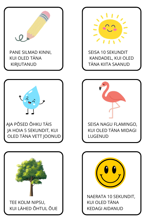 Tegevuskaardid liikumispausiks – 6 lehte, ühel lehel on 6 kaarti, kokku 36 erinevat tegevuskaarti.