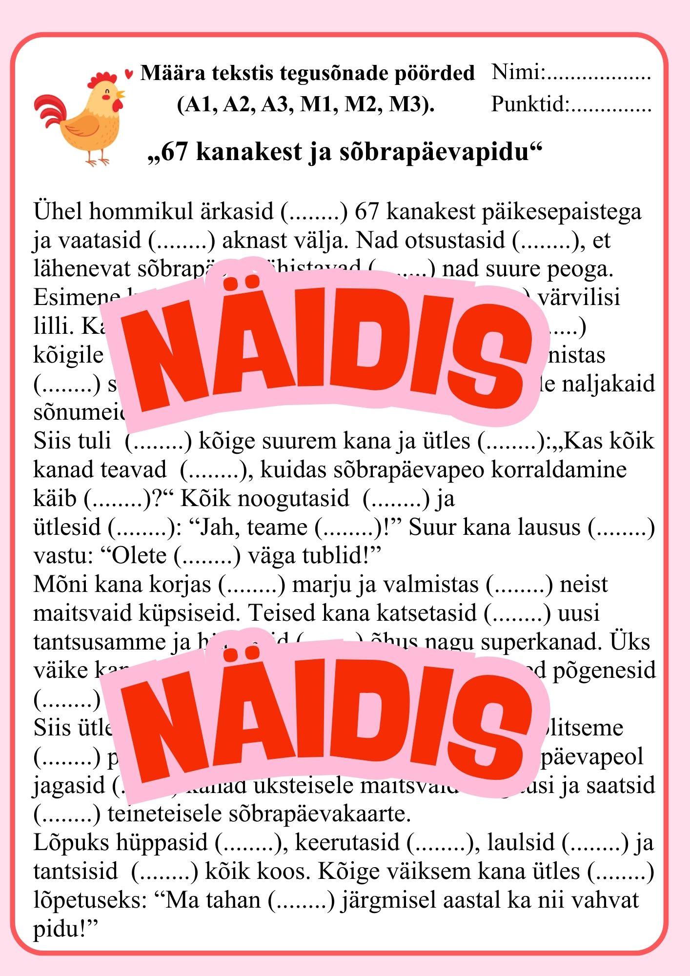 Jutukeses “67 kanakest ja sõbrapäevapidu” tegusõna pöörete määramine. Failis on tööleht + vastuste leht.