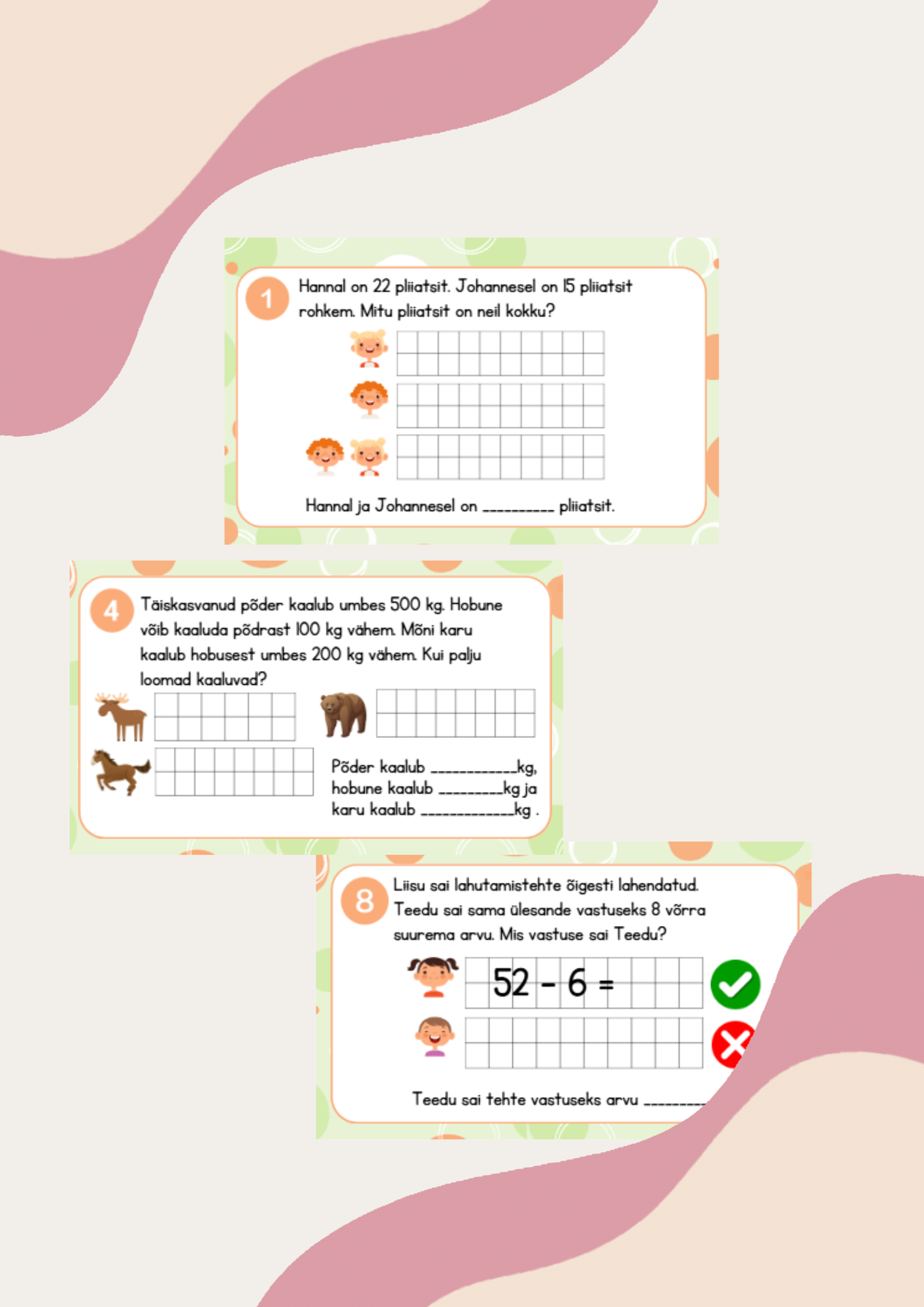 Ühe- ja kaheastmelised ülesanded. On lihtsamaid ja pisut keerukamaid. Ühel lehel on kaks ülesannet.