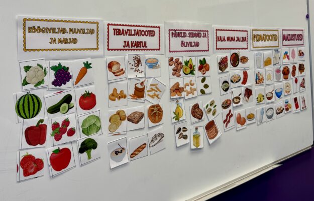 - Pildikaardid erinevatest toiduainetest (nt puu- ja köögiviljad, teraviljatooted, piimatooted, liha- ja kalatooted, pähklid-seemned-õliviljad, maiustused).