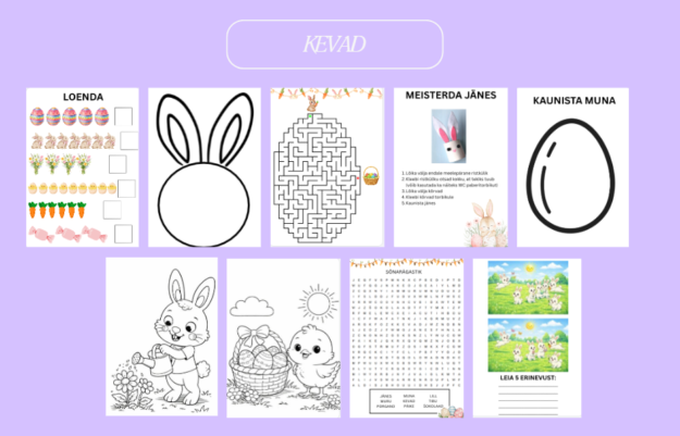 Loendamine, värvimine, labürint, meisterdamine, leia erinevused, sõnarägastik.