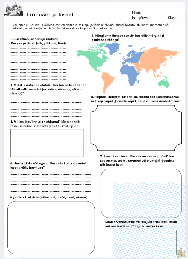 Tööleht „Linnused ja lossid“ aitab õpilasel uurida mõnda kuulsat keskaegset lossi või linnust ning avastada, kuidas need olid seotud tolleaegse elu, võimu ja arhitektuuriga.