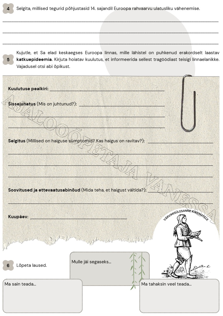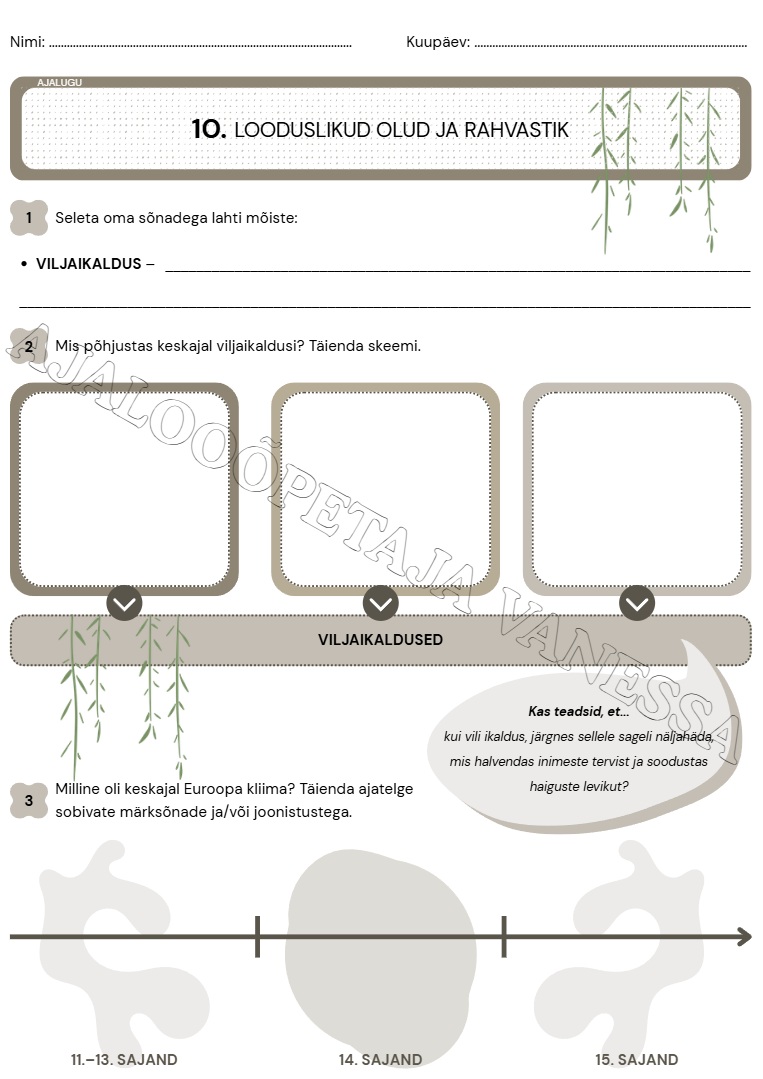Tööleht “Looduslikud olud ja rahvastik” on loodud 7. klassi ajalooõpiku (Avita, 2011) põhjal. Komplektis sisaldub lisaks värvilisele töölehele ka mustvalge formaat, mis sobib hästi säästlikuks printimiseks või paljundamiseks.