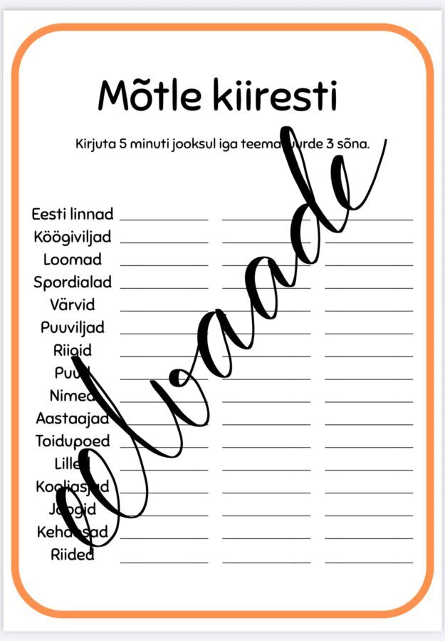 Töölehel on 16 erinevat teemat, mille juurde tuleb kirjutada 3 sõna 5 minuti jooksul.