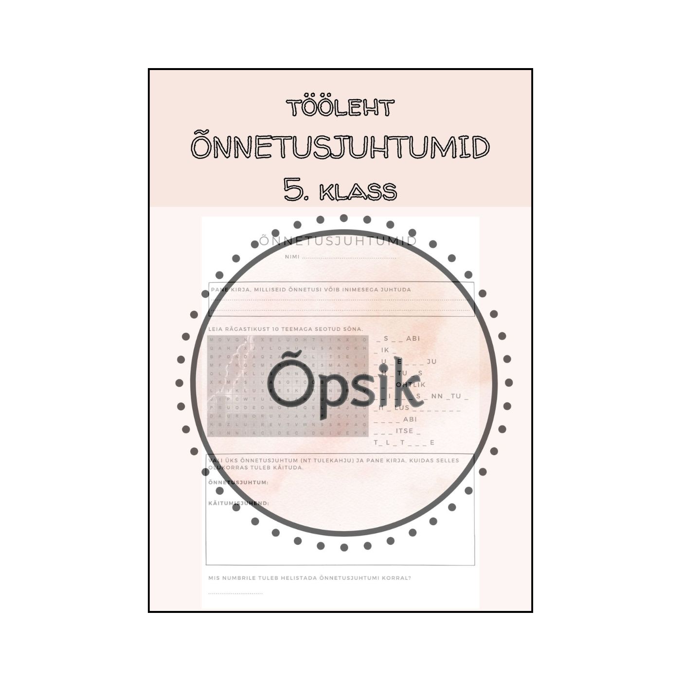 Tööleht 5. klassile õnnetusjuhtumite (ja riskikäitumise) teema sissejuhatuseks või kordamiseks. Töölehel on neli ülesannet: võimalike õnnetusjuhtumite kaardistamine, sõnarägastik, õnnetusjuhtumi käitumisjuhendi koostamine ning häirekeskuse telefoninumbri kirjutamine.