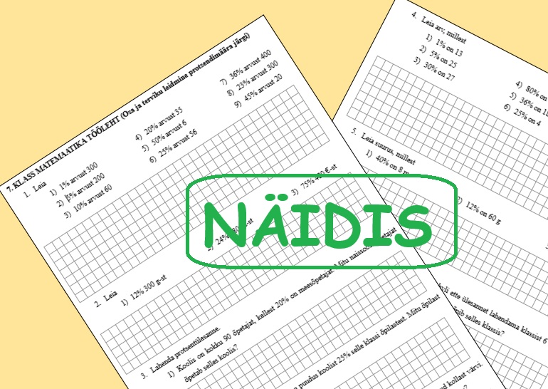 Tööleht 7. klassi protsentarvutuses osa ja terviku leidmise kohta. Tööleht on esitatud kahepoolse PDF failina.