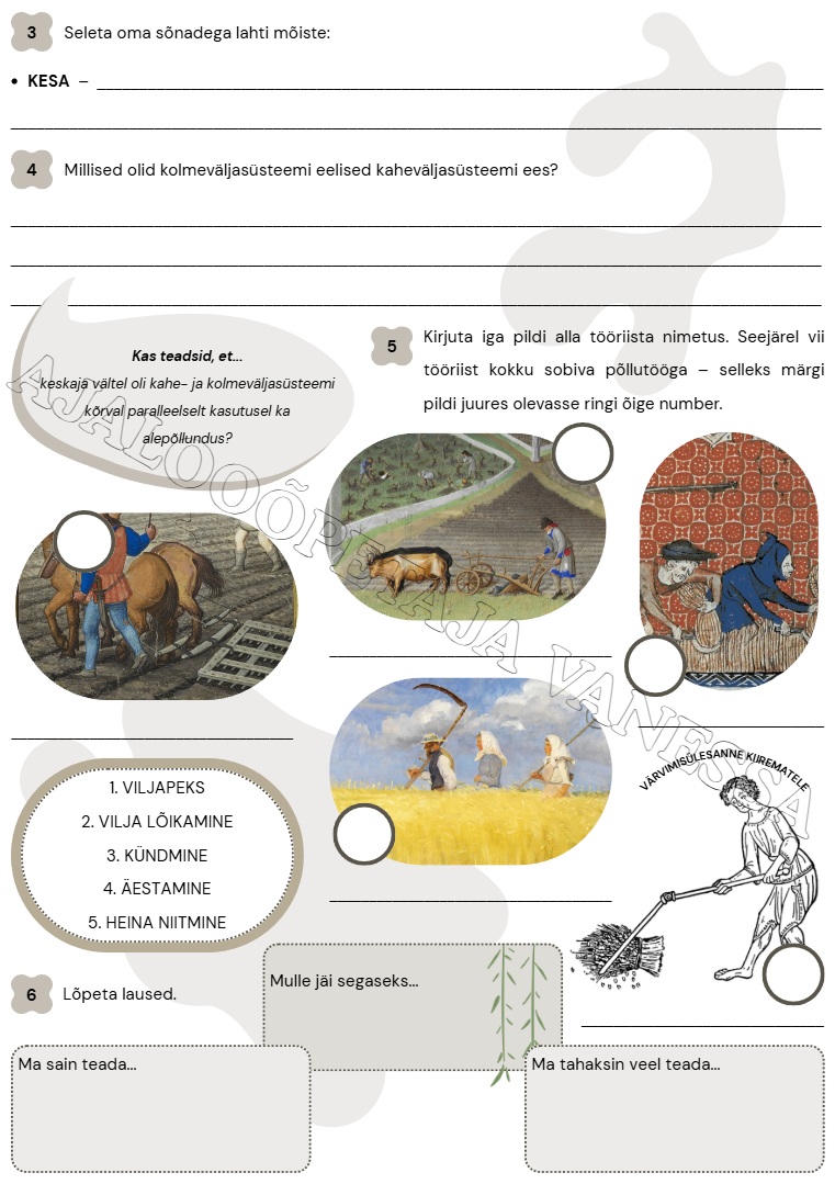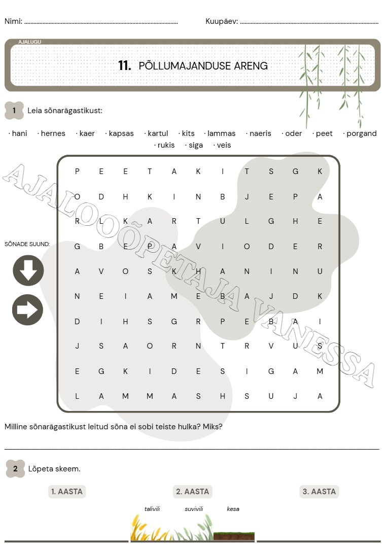 Tööleht “Põllumajanduse areng” on loodud 7. klassi ajalooõpiku (Avita, 2011) põhjal. Komplektis sisaldub lisaks värvilisele töölehele ka mustvalge formaat, mis sobib hästi säästlikuks printimiseks või paljundamiseks.