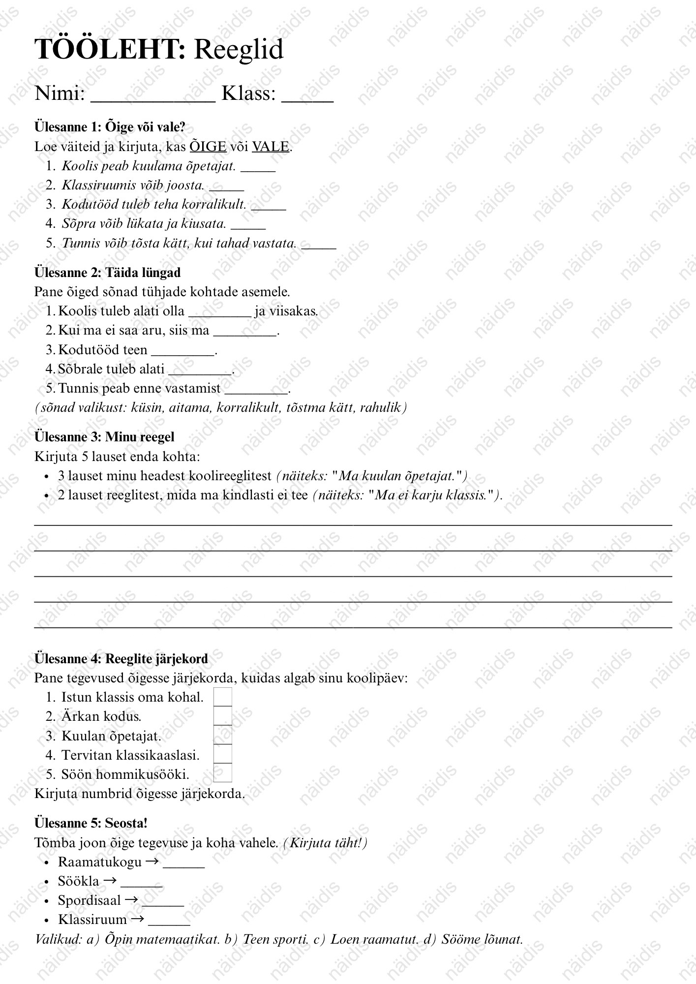 See on tööleht „Reeglid“, mis aitab õpilastel õppida ja kinnistada koolireegleid läbi erinevate ülesannete (õige/vale, lüngad, laused, tegevuste järjekord, seostamine). Sobib põhikooli õpilastele.