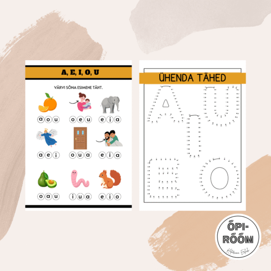 Kahepoolne tööleht, mis aitab korrata tähti A, E, I, O ja U.