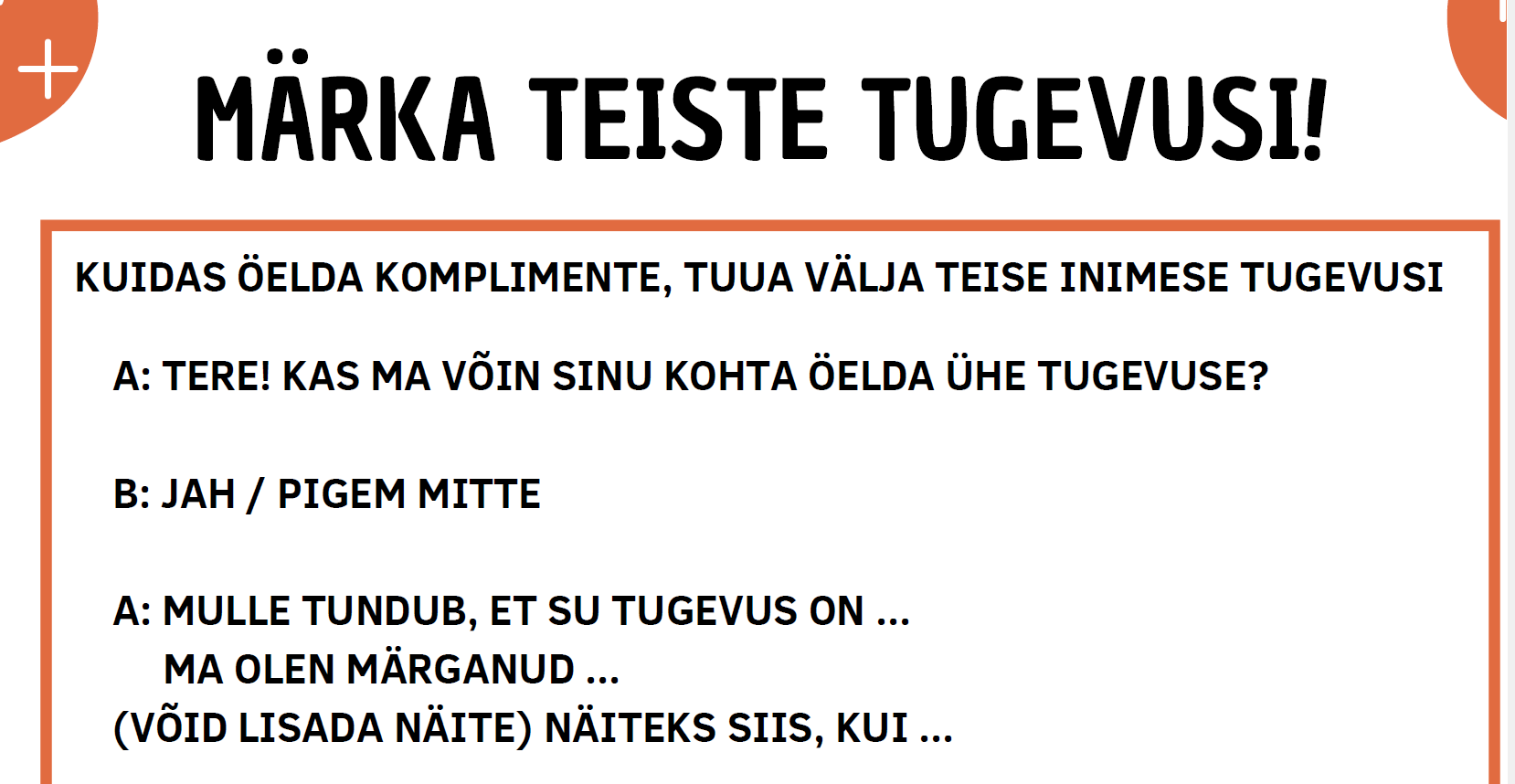 Tööleht aitab tunnis osalejatel harjutada üksteise tugevuste märkamist ja väljatoomist. Sobib olukorras, kui õpilased juba üksteist mõnevõrra tunnevad ning õhkkond on turvaline. Ülesande läbiviimisel on oluline rõhutada, et keskendutaks ainult positiivsele (see toetab traumateadlikkust).