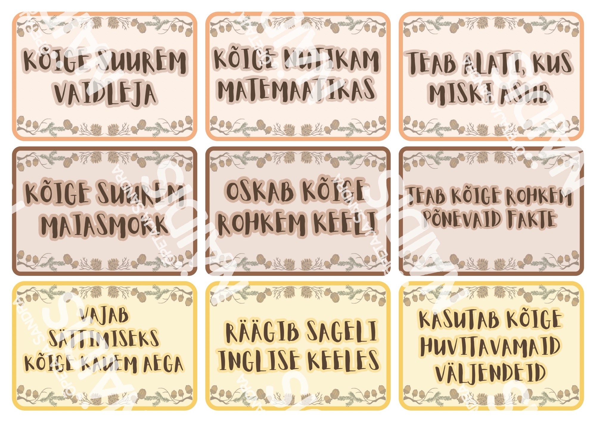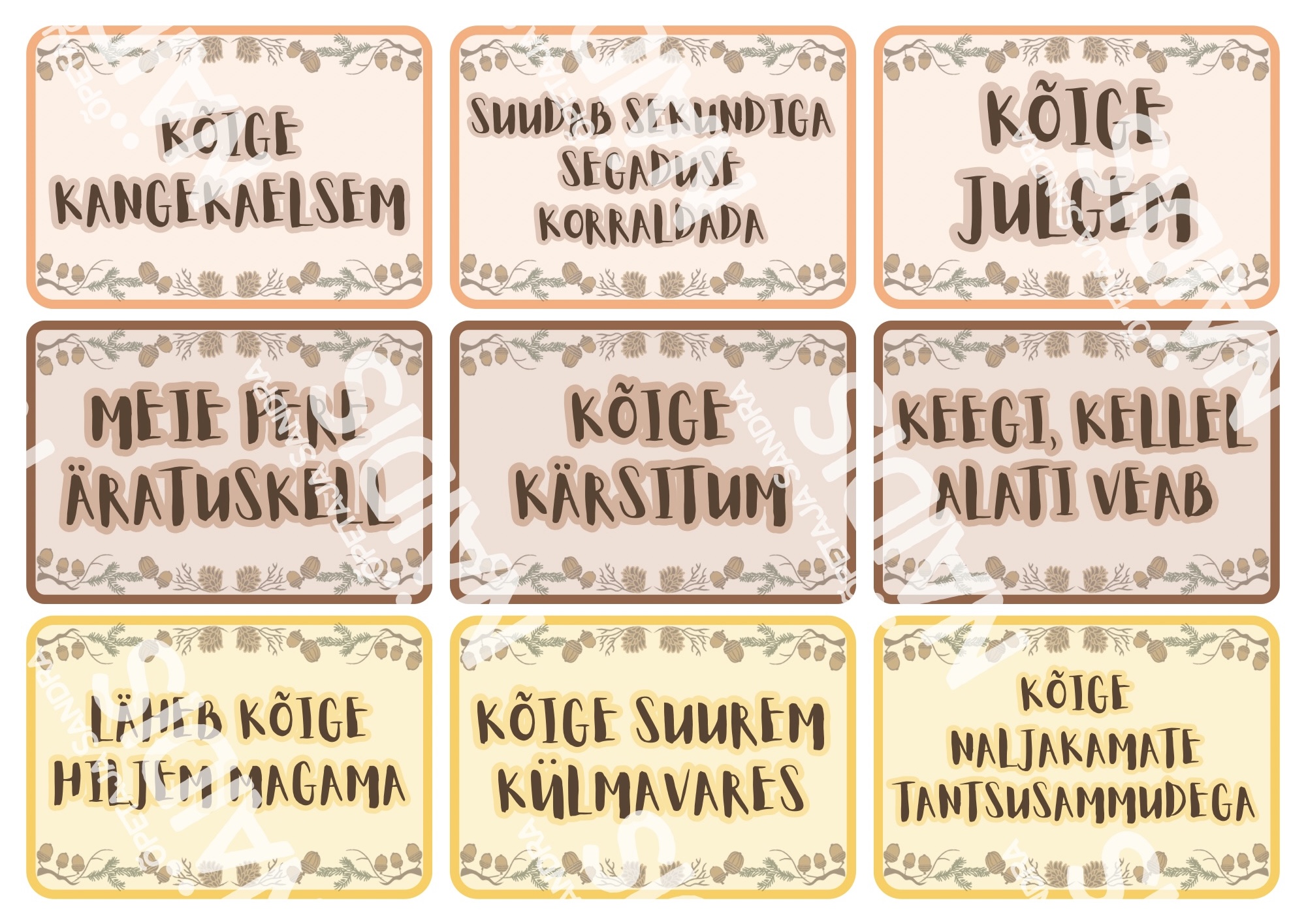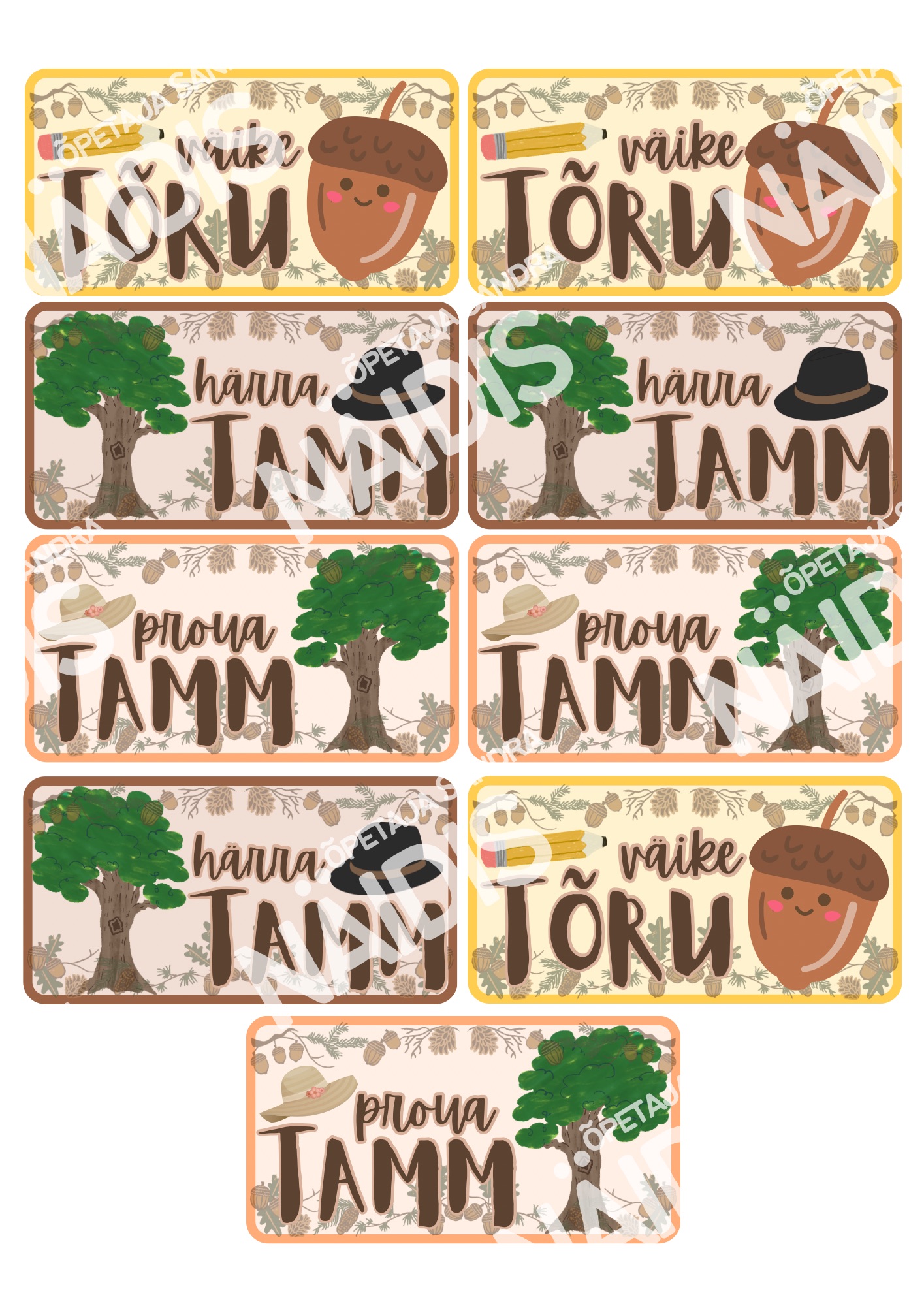 🌰 Kaardid on kahepoolsed (esiküljel kirjeldus ja pöördel täpiline taust) ning tõru ja tammede kaarte on vastavalt soovile võimalus printida kahes suurusformaadis.