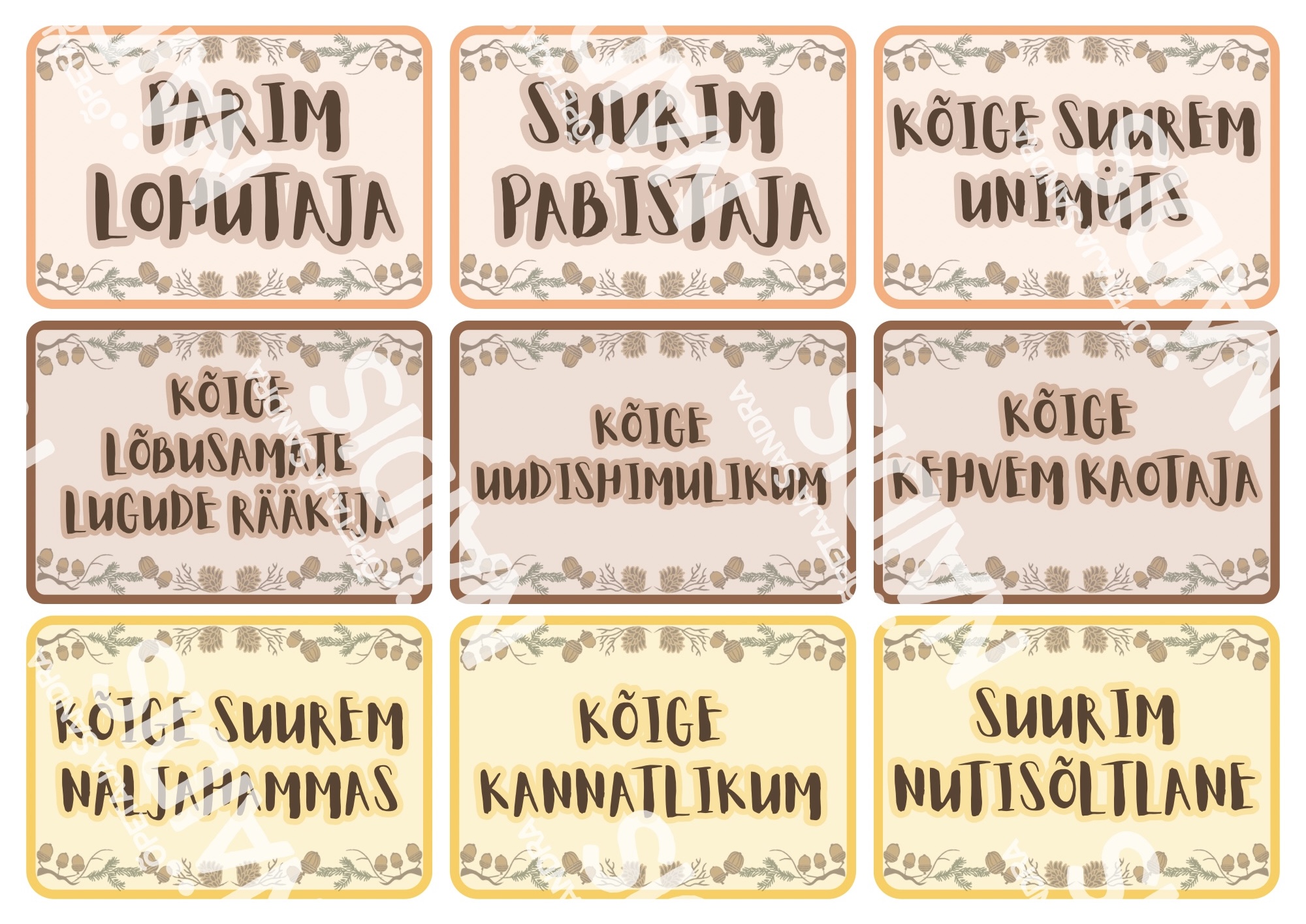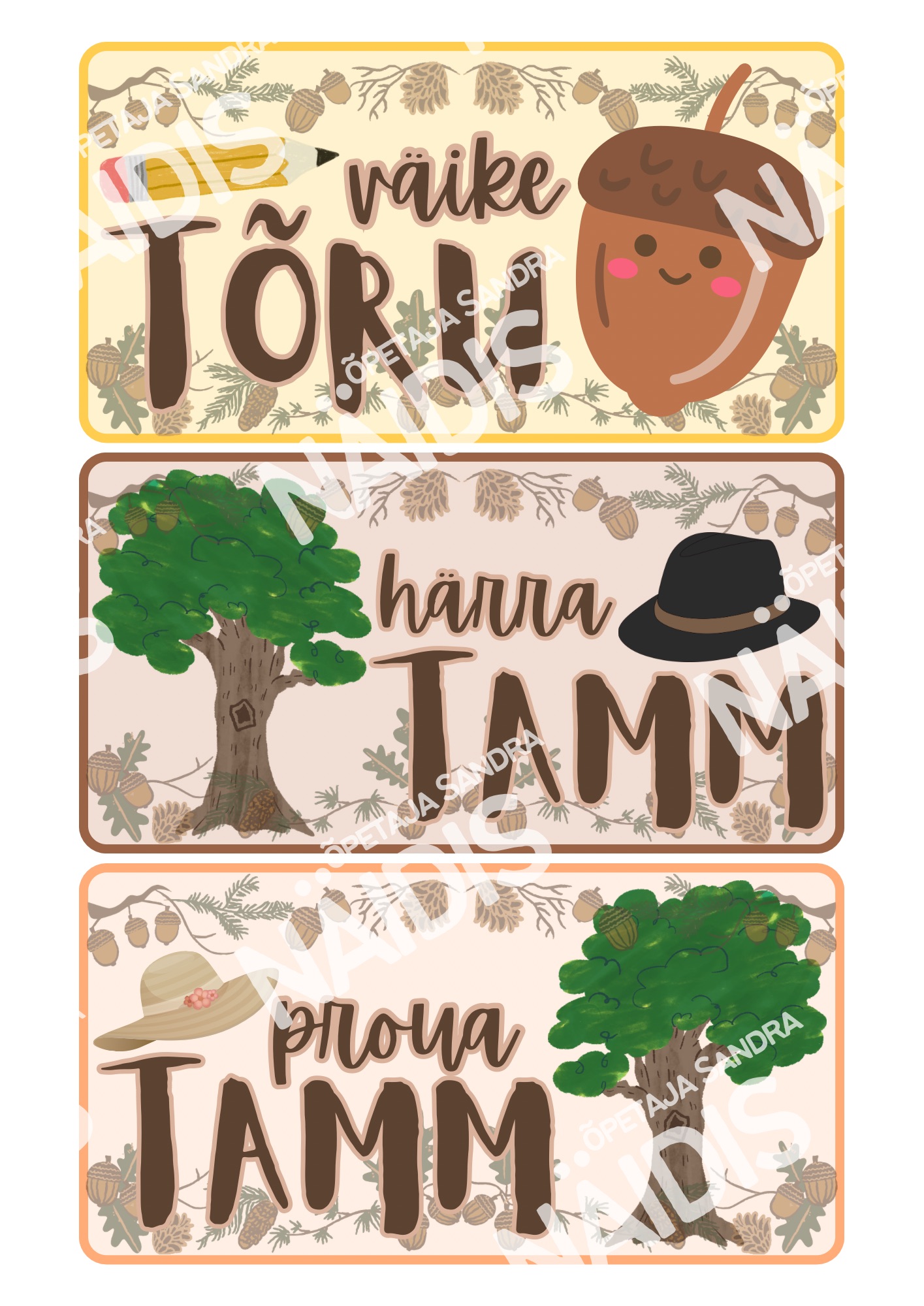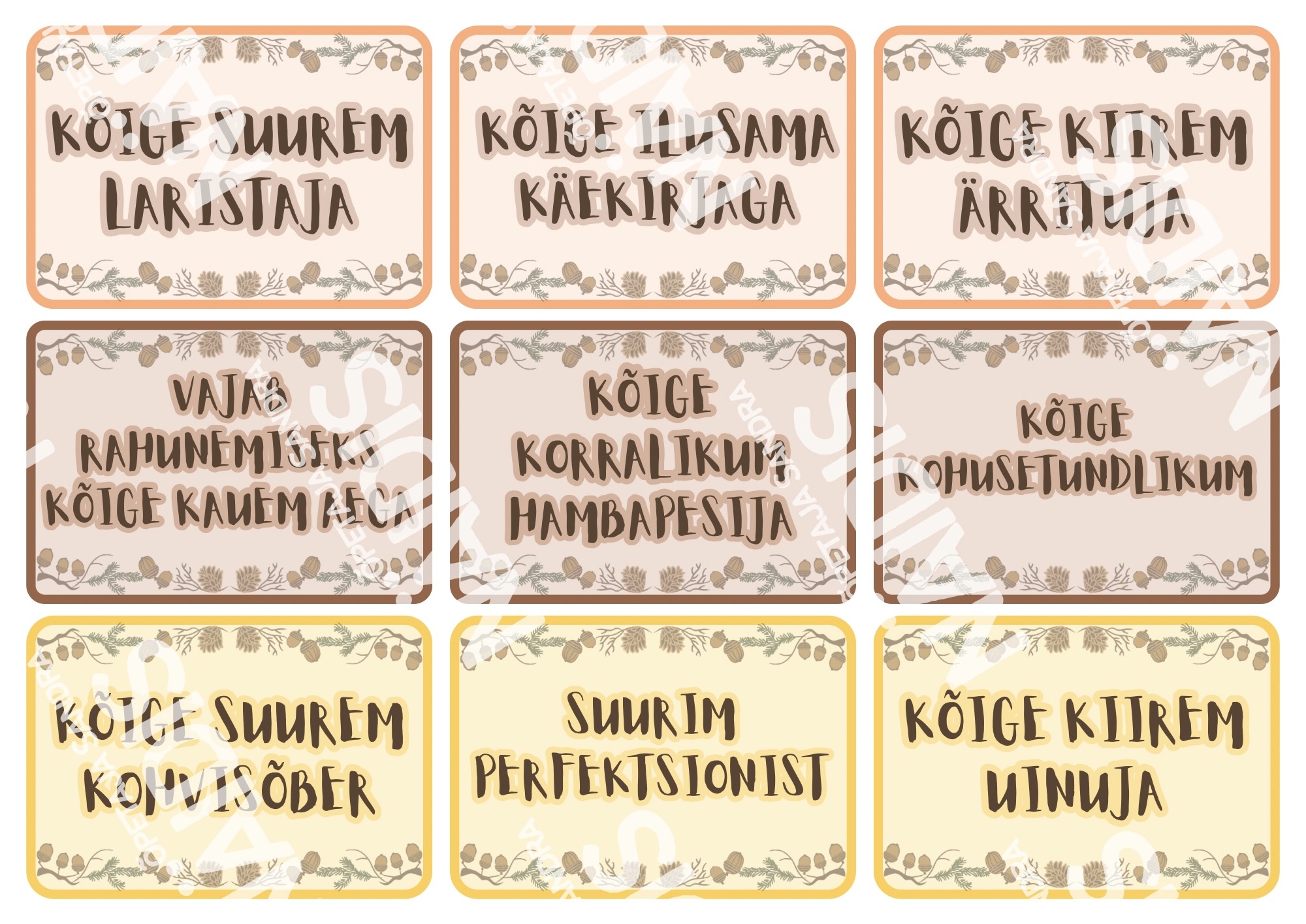 🌰 Kaardid on kahepoolsed (esiküljel kirjeldus ja pöördel täpiline taust) ning tõru ja tammede kaarte on vastavalt soovile võimalus printida kahes suurusformaadis.