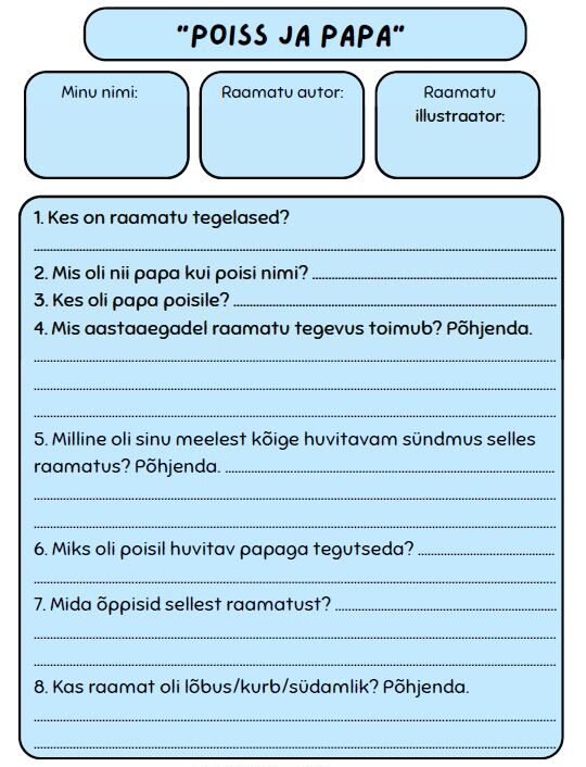 Tööleht sobib 1.-3. kl õpilastele Triinu Laane raamatu “Poiss ja papa” kokkuvõtte tegemiseks.