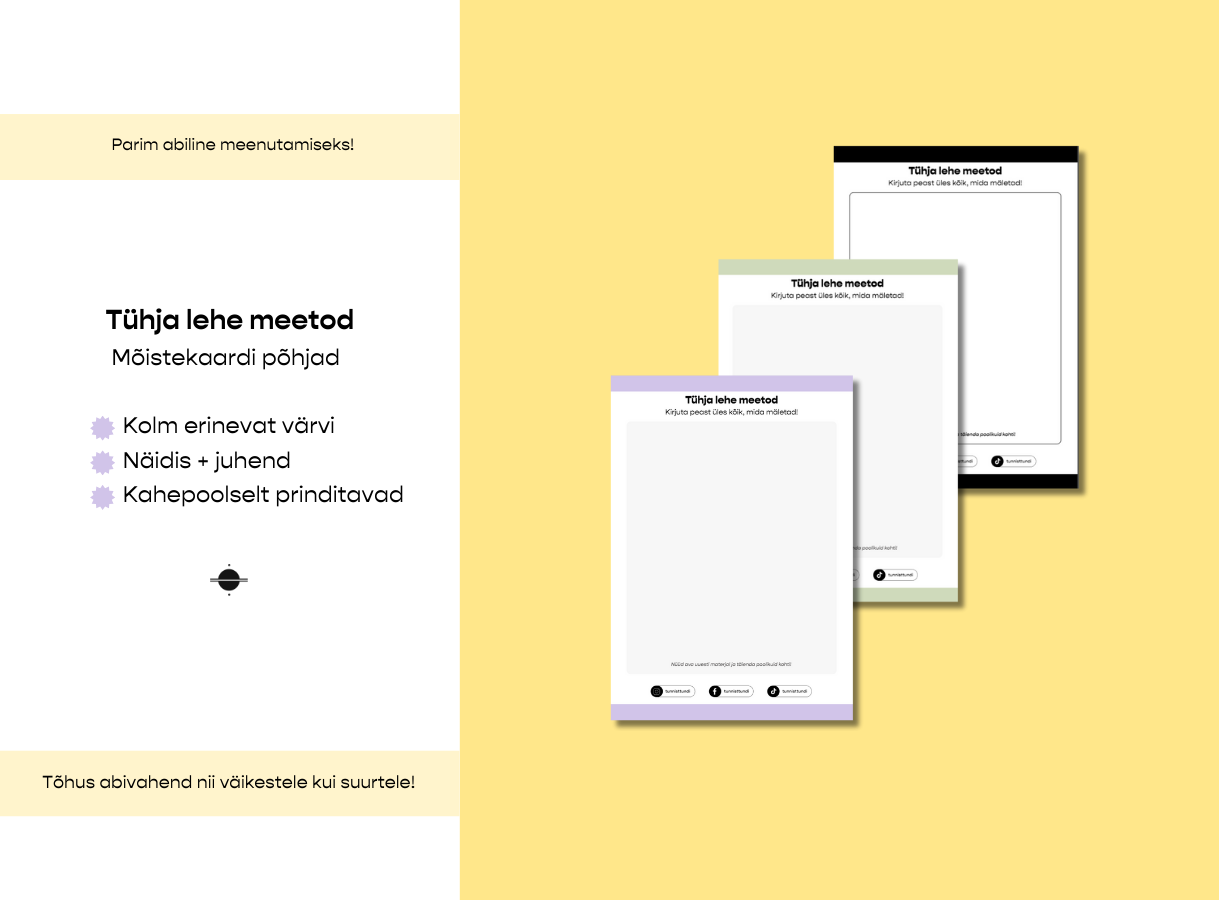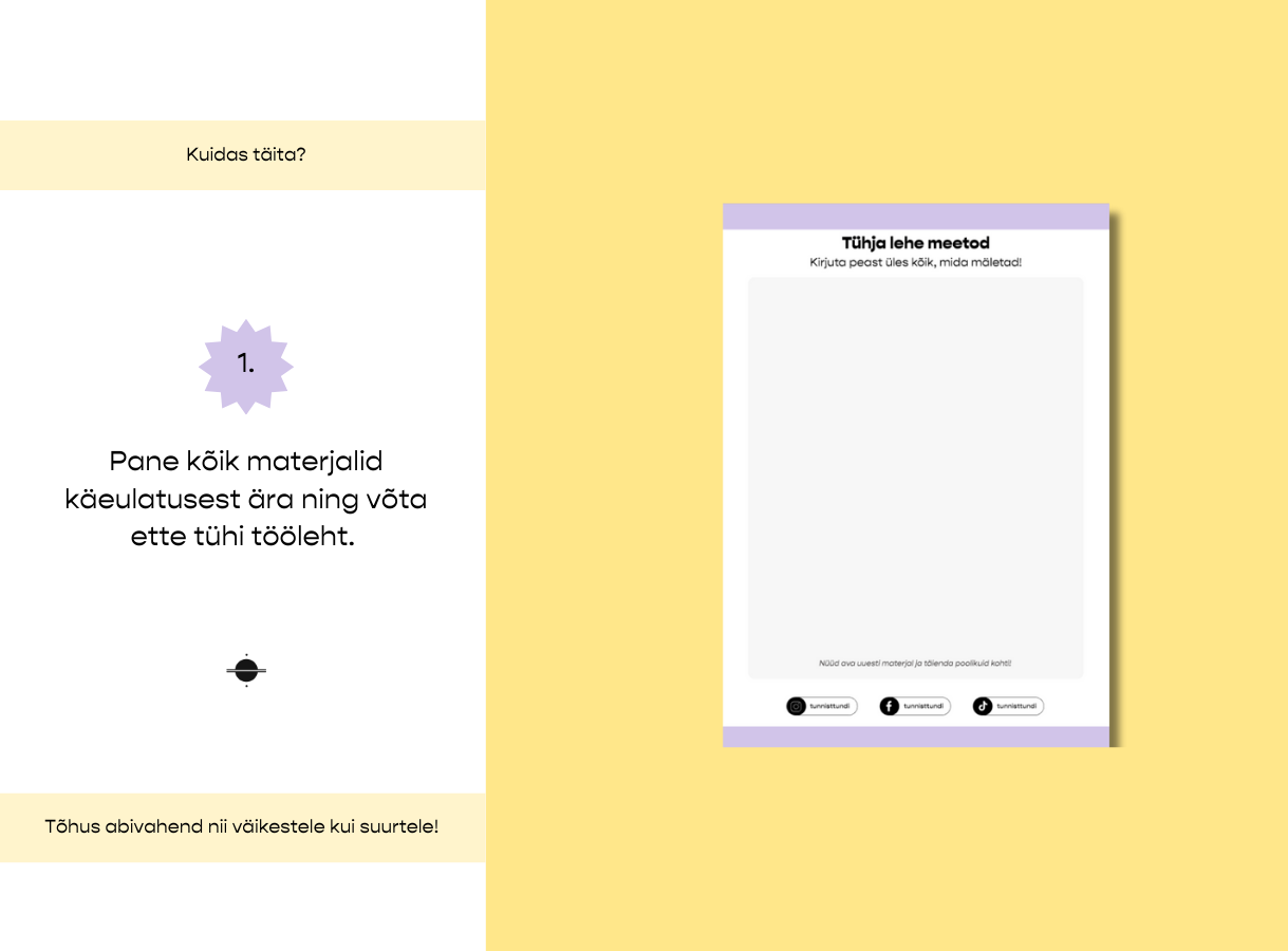 Tühja lehe meetodi materjalid sisaldavad kolmes erinevas värvitoonis töölehti, näidist ja juhendit. Nii saad meetodi kasutamisega lihtsalt peale hakata!
