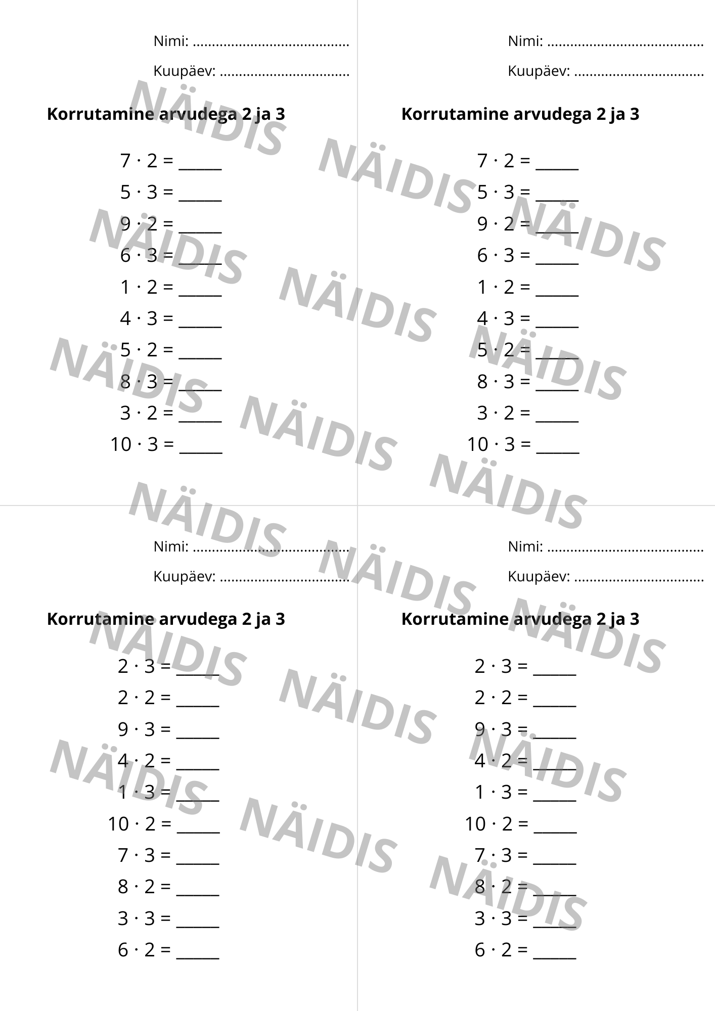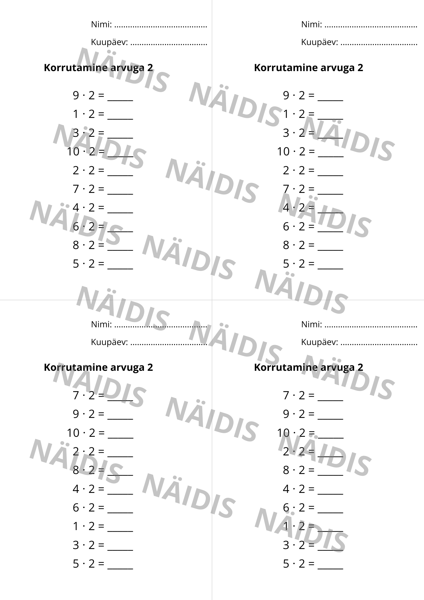 Fail sisaldab seitset korrutamise tunnikontrolli kahes variandis.