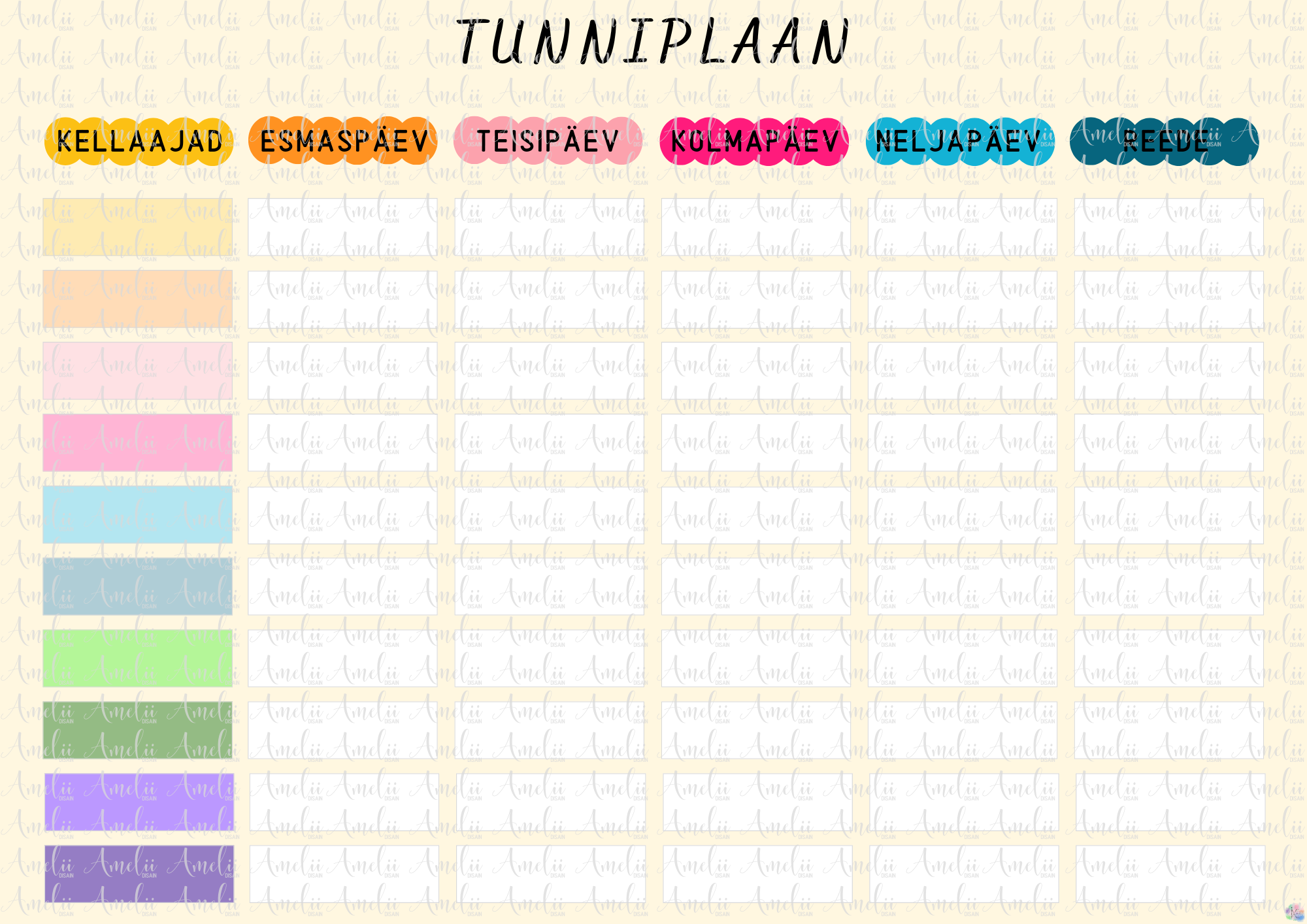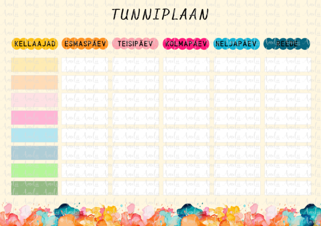 Tunniplaan aitab õpilasel kirja panna oma tundide kellaajad ja õppeained, hoides koolinädala info selgelt organiseerituna. Lihtne ja ülevaatlik kujundus toetab ajaplaneerimist ning igapäevast kasutamist.