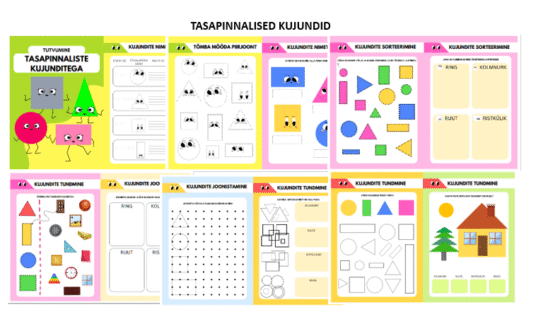 Tutvumine tasapinnaliste kujunditega (eelkoolile/ 1. klassile). Töölehtede komplekt, koos tiitellehega 12 lk.