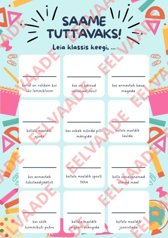 Lõbus mäng teineteisega tutvumiseks. Mängu eesmärk on leida kirjeldustele vastavad klassikaaslased ja nende nimed kastidesse kirjutada. Mängu käigus õpivad lapsed teineteist paremini tundma.