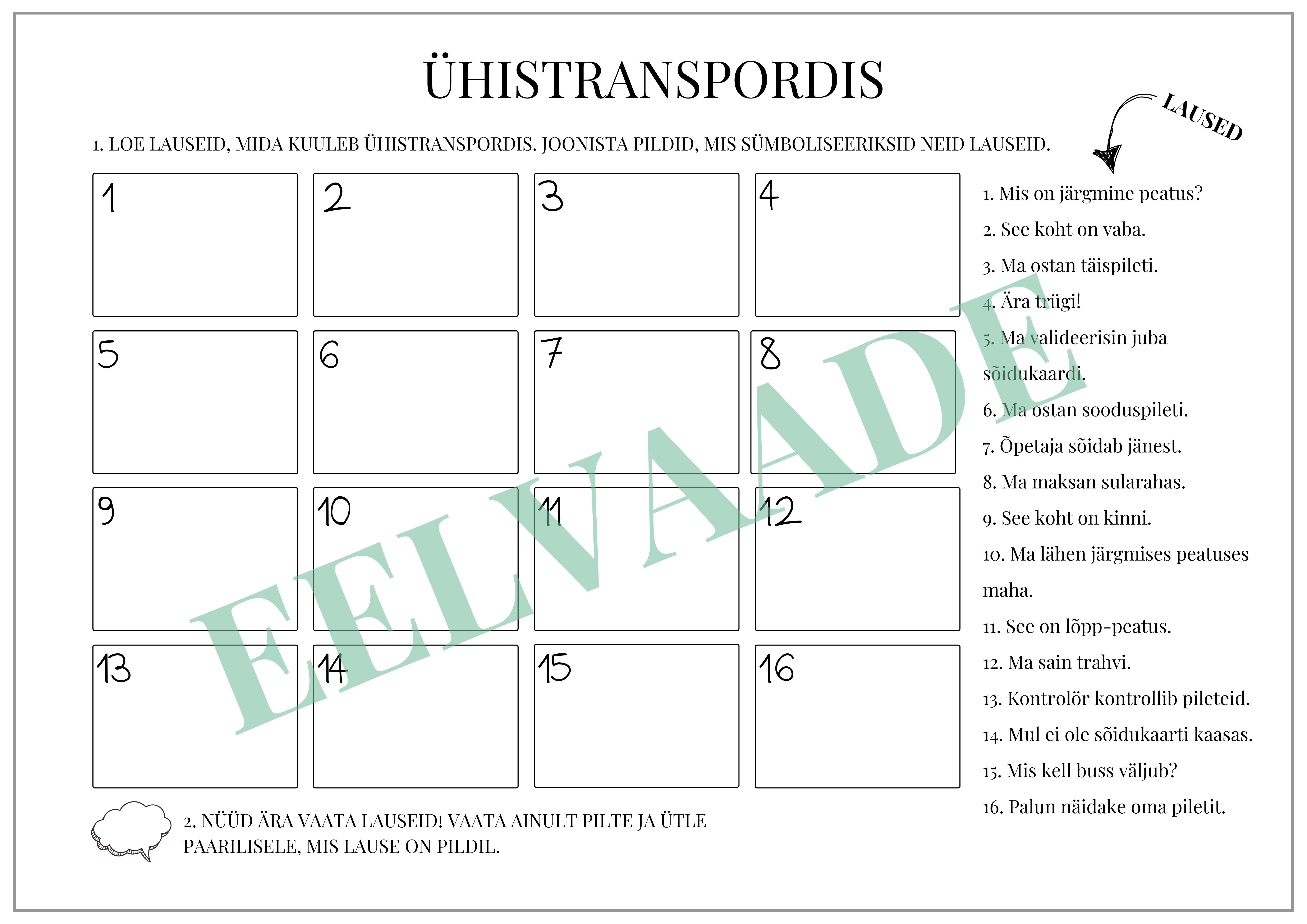 Tööleht ühistranspordis vajalike lausete õppimiseks. Õpilased joonistavad pilte, mis sümboliseeriksid lauseid.