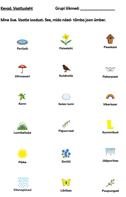 Kevad on alanud. Missuguseid kevade tunnuseid või märke õues näeme? Minge õue ja vaadake- kõik näevad kindlasti erinevaid asju (sõltuvalt ilmast või kohast). Sobib väga hästi grupitööks.