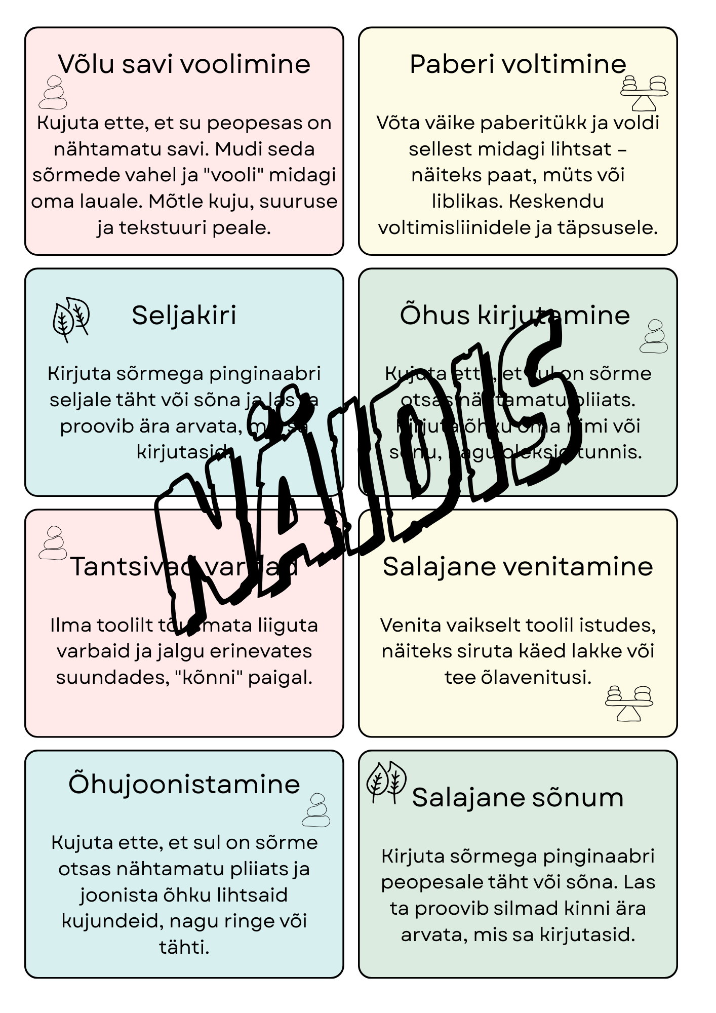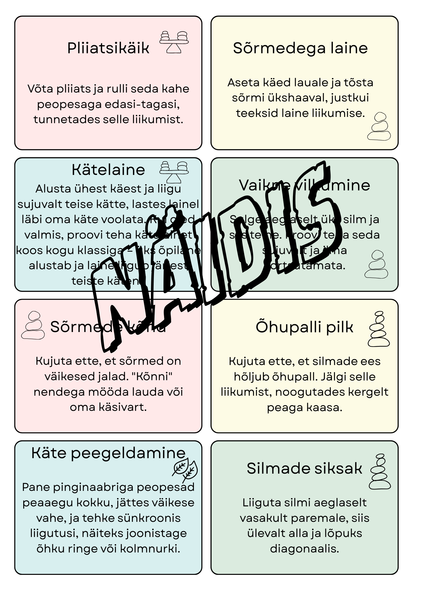 Vaiksed pausikaardid on praktiline töövahend õpetajale, mis aitab tuua koolipäeva lühikesi ja rahulikke pause – nii, et õpilased saaksid puhata ja keskendumise taastada ilma liigse mürata või üleliigse aktiivsuseta.