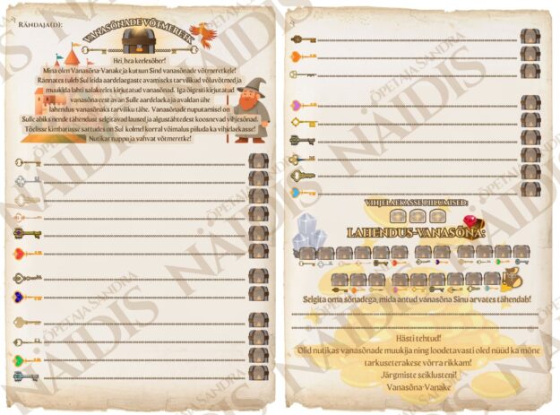 🧙🏻♂️ Õpilased saavad vastustelehe, mis algab kirjaga Vanasõna-Vanakeselt, kes õpilastele “retke” ülesehitust tutvustab. Õpilastel tuleb liikuda, leida ja “koguda” võlulaegaste avamiseks tarvilikke võluvõtmekesi. Võtmekese kogumiseks tuleb aga eelnevalt “lahti muukida” ja vastustelehele kirja panna salakeeles esitatud vanasõnad (kokku 21 üldtuntud vanasõna).